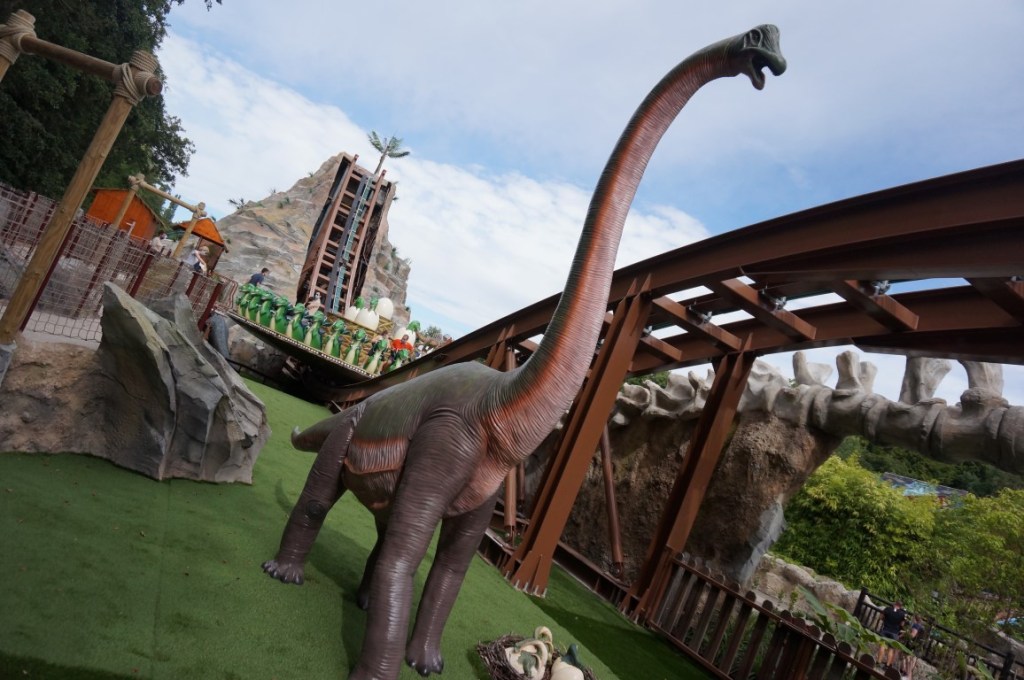 Credits hier, credits daar, credits overal. Doorgaans gebruik ik Coaster-Count als leidraad om mijn aantal achtbanen te tellen. Recent heeft die website echter Disk’O Coasters als achtbanen gedefinieerd, wat een rare move lijkt. In mijn ogen is dit namelijk een doodgewone thrill ride die (ondanks zijn naam) weinig met achtbanen te maken heeft. Maar ach… Coaster-Count heeft meestal gelijk, zullen we maar denken? Het zorgt ervoor dat ik vanaf nu vaker Disk’O Coasters zal doen, hoewel ik het eigenlijk misselijkmakende ondingen vind. Een voordeel: dit attractietype is vaak tof gethematiseerd. Dat geldt ook voor Dino Disk’O, die in een rotsachtig landschap geïntegreerd is. De vlakbij gelegen Dino Splash ziet er minstens even aantrekkelijk uit, maar lijkt ons wel erg nat. Die boomstammenbaan slaan we vanochtend dus over.