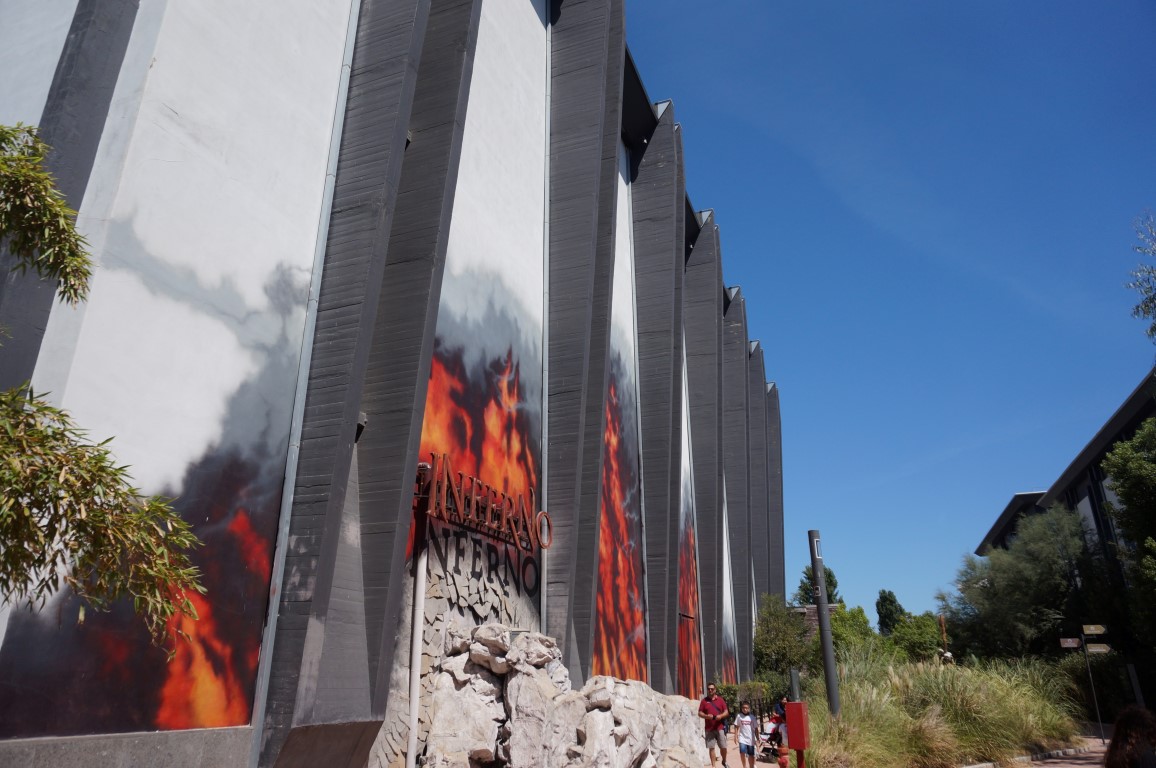 Van Leonardo da Vinci naar Dante. En wie Dante zegt, die zegt Inferno. Hier in Cinecittà World is Inferno een overdekte rollercoaster van Intamin. Van buitenaf zie ik enkel een reusachtige hangar en een weinig indrukwekkend naambord, maar Nick (die Cinecittà World enkele jaren geleden reeds bezocht) verzekert me dat er een fantastische ride achter schuilt. Een overdrijving blijkt dat niet. Het cijfermateriaal is nochtans niet buitensporig: met een lengte van 455 meter en een topsnelheid van 70 kilometer per uur lijkt Inferno een relatief alledaagse familieachtbaan. Wanneer ik plaatsneem, merk ik echter vlug dat de designers van deze coaster een standbeeld verdienen. Ze propten achtereenvolgens een fantastische eerste afdaling, enkele heftige bochten en een fijne drop track in deze loods. De daarbij voorziene decoratie is simpel, maar effectief. Het duistere sfeertje van deze ride werkt alleszins beklijvend. Zo beklijvend zelfs dat we onmiddellijk een tweede en derde ritje maken… om daarna met een minstens even extatisch gevoel uit te stappen. Als dit de hel is, wil ik daar later gerust heen gestuurd worden.