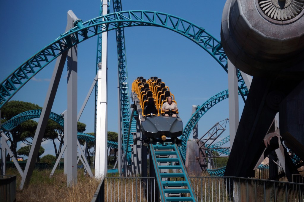 We schuiven kortstondig aan voor Aquila IV, maar de tergend traag vorderende rij jaagt ons vlug weer weg. Het feit dat onze voorgangers een haarnetje en een zware legerhelm moeten dragen, maakt het zo mogelijk nog oninteressanter bij 35°C. Ik vermoed overigens dat we niet veel missen. Dit is een walk-through in een duikboot, gebaseerd op de oorlogsfilm U-571. Kan best knap zijn, maar mij trekt het niet. Bovendien komen we volgende week nog een duikbootattractie tegen in een ander Italiaans pretpark en ik ben ervan overtuigd dat die ride spannender is. Wordt dus (op kletsnatte wijze) vervolgd in Movieland aan het Gardameer.