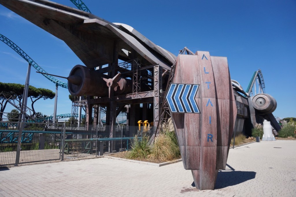 Zo, het is tijd voor een achtbaan hè? Na binnenkomst zien we onze medebezoekers massaal naar waterattractie Aktium marcheren, dus wij trekken meteen dieper het park in. Zo arriveren we al snel in themazone Spaceland, waar Altair de blikvanger is. Deze rollercoaster heeft een verhaallijn waarin de mensheid na eeuwenlange afwezigheid opnieuw de Aarde bereikt. Heel boeiend is het allemaal niet, maar het verklaart de futuristische styling van het stationsgebouw. Helaas blijft het daar ook bij, want Altair staat gewoon op een dor stukje land aan de rand van het park.