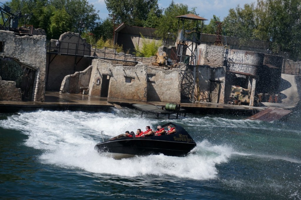 Als de mislukte onderwaterexpeditie van U-571 nog niet nat genoeg was, kan je altijd nog doorweekter worden bij buurman Kitt SuperJet. Na een wachttijd van ongeveer een halfuur worden we hier getrakteerd op een spektakelrit in een speedboot. Vergeet alle suffe rondvaartbootjes die je ooit in een pretpark zag, want tijdens deze drie minuten gelden er andere regels. Movieland adverteert met twee pijlsnelle speedboten, 600 pk en bestuurders die behoorlijk riskante truukjes uitvoeren. Eigenlijk is Kitt SuperJet daardoor een soort Magma op het water en de sensatie ligt zo mogelijk op een nog hoger niveau. De natheidsgraad trouwens ook: wij zitten op de laatste rij en we krijgen twee enorme vloedgolven over ons heen. Bij deze hitte ervaar ik dat niet als storend, maar dat ene ritje was toch ruim voldoende. Niek en Nick denken er trouwens anders over en gaan later vanmiddag nogmaals aan boord.