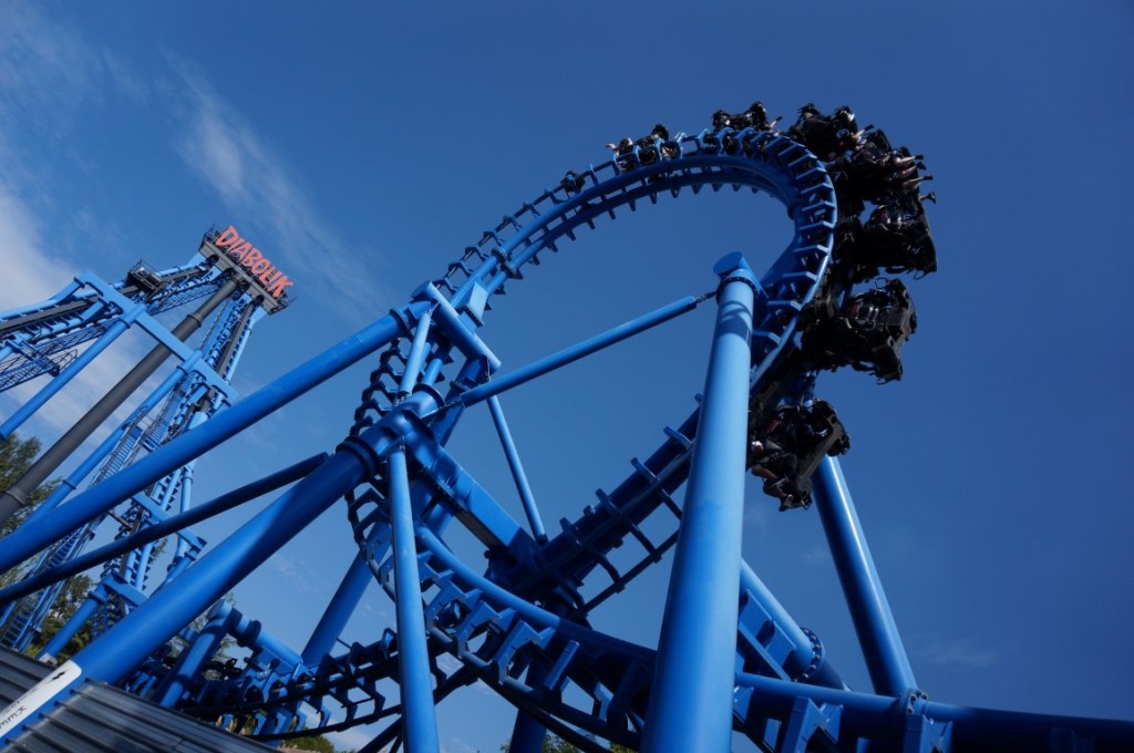 Movieland Park levert me tijdens dit bezoek geen enkele credit op. Toch ligt dat aan mezelf, want men gaf me wel de kans om een nieuwe achtbaan te bezoeken. Diabolik staat sinds 2015 in het park en het is een opvallende verschijning. Dat ligt niet alleen aan de felblauwe rails, maar ook aan de locatie. Deze Vekoma Invertigo staat namelijk gedeeltelijk in het aanpalende CanevaWorld Aquapark. Het station van deze achtbaan bevindt zich zelfs letterlijk onder de hoogste glijbaantoren van het waterpark. Dat kan boeiend zijn om Speedo’s te keuren tijdens een achtbaanrit, maar zo’n misselijkmakende Boomerang sla ik alsnog liever over.