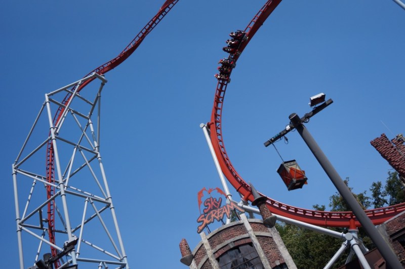 Van Sky Fly naar Sky Scream. Deze driedubbel gelanceerde achtbaan deed heel wat wenkbrauwen fronsen toen hij in 2014 opende. Niet zozeer omwille van de ride (dit is een standaardmodel van Premier Rides), maar omwille van de decoratie. Sky Scream heeft namelijk een horrorthema en de wachtruimte is een behoorlijk griezelige walk-through. We moeten amper 10 minuten aanschuiven, maar we merken wel dat er een heleboel geslaagde schrikeffecten en mysterieuze belichting op. Origineel en cool, maar niet hetgeen je van Plopsa verwacht. Ook de eigenlijke rit is trouwens best heftig: de lanceringen zijn krachtig en er zitten een aantal pittige manoeuvres in de lay-out. Sky Scream is niet de beste achtbaan ter wereld, maar al bij al is dit een uitstekende thrill coaster voor ieder middelgroot attractiepark.