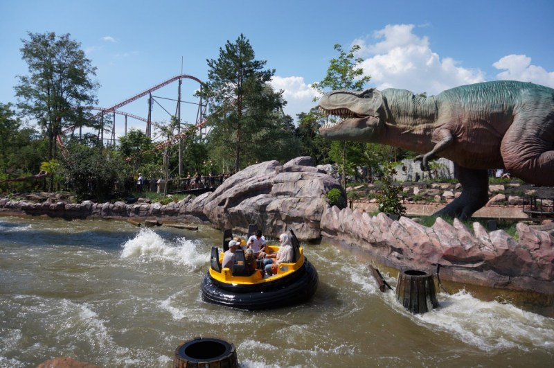 De kans is reëel dat Burg Falkenstein ooit omgebouwd wordt naar een darkride met een familialer karakter (update: die ombouw is ondertussen ook bevestigd). Overbuurman DinoSplash onderging recent alvast een stevige renovatie. Deze rapid river wordt gepromoot als nieuw, maar dat is hij niet helemaal. De attractie opende als Donnerfluss en staat er al sinds 1984. Het principe van deze semi-nieuwigheden bestaat ook in Plopsaland De Panne, waar een gelijkaardige transformatie plaatsvond bij de boomstammenbaan. Ik vind het enigszins misleidend om dergelijke rides als nieuw aan te prijzen, maar ik moet tegelijkertijd toegeven dat het resultaat voortreffelijk is. DinoSplash baadt in een museumachtig sfeertje en het werkt prima. Bovendien zijn de dino-animatronics imposant en de attractie bevat een aantal goeie stroomversnellingen. Dit is dus een uitstekende rapid river en het publiek smult ervan. Vandaag kunnen we na vijf minuten inschepen, maar op drukke dagen moet je hier gegarandeerd làng aanschuiven.