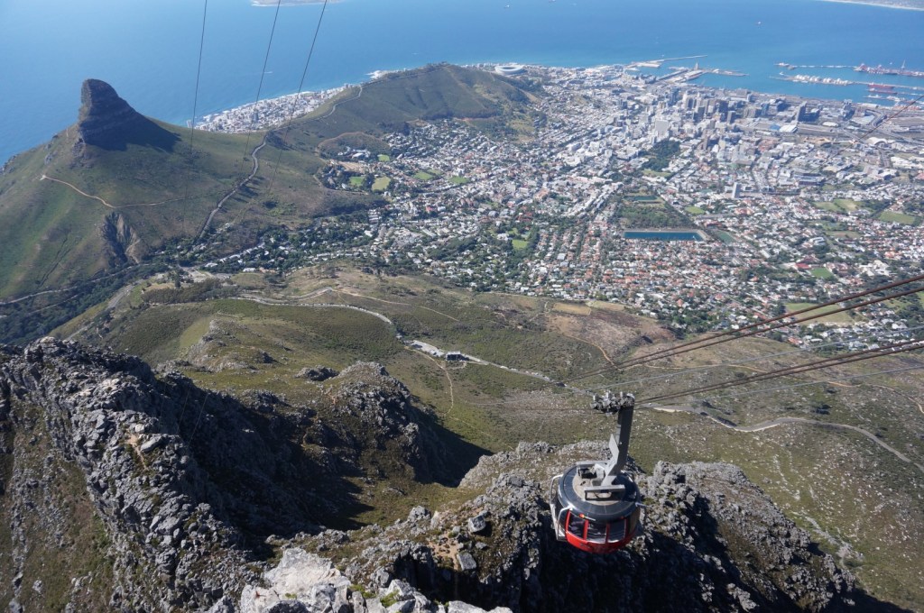 Goed, we waren hier dus voor de Table Mountain Aerial Cableway. En geloof me; dat is een indrukwekkend ding. De cabines bieden plaats aan 65 passagiers en ze overbruggen in een vijftal minuten een hoogteverschil van 765 meter. Een van de opvallendste elementen is de vloer van de cabine, die zachtjes roteert tijdens de klim en daling. Daardoor krijgt zowat elke passagier het ultieme uitzicht op Kaapstad en de ruime omgeving. Het spreekt voor zich dat al dit moois niet gratis te beleven valt. Een retourtje met de kabelbaan kost omgerekend ongeveer 19 euro, wat naar Zuid-Afrikaanse normen best een stevige prijs is.