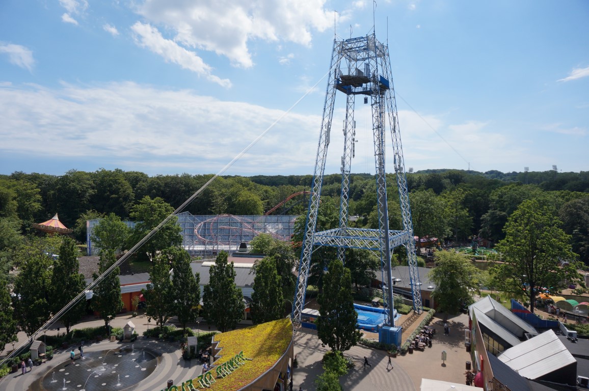Net zoals vele stadspretparken in Noord-Europa, moet Tivoli Friheden het met een relatief beperkte oppervlakte doen. Attracties die eerder in de hoogte dan in de breedte werken, zijn voor zulke parken bijgevolg een zegen. Het was daarom niet eens heel verrassend om twee verschillende vrijevaltorens te ontdekken. Beide torens hadden overigens een verrassend elementje. De 65 meter hoge Hjertekig fungeert bijvoorbeeld niet louter als thrill ride, maar ook als rustige panoramatoren. Het merendeel van de bezoekers leek voor de free fall te kiezen, maar de operator kan de gondel van deze attractie ook gewoon traag terug naar de begane grond laten zakken. Tijdens ons ritje gaf de lieve parkmedewerkster overigens nog wat extra uitleg door middel van de luidsprekers aan de top van de toren.