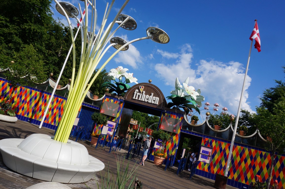 Tivoli Friheden is een park voor langslapers. We bezochten het park op een weekenddag, maar toch gingen de deuren pas om 11.30 uur open. Op het openingsuur van de attracties was het bovendien nog een half uur langer wachten, dus haast was er die ochtend allerminst. Na een rustig ontbijtje nabij het hotel en een aangename wandeling door het groen, arriveerden we kort na de middag bij de toegangspoort van het park. Ondanks het mooie zomerweer bleek het geen overrompeling in Tivoli Friheden: een vriendelijke kassadame zat ons geduldig op te wachten en in de Main Street (of Hovedgade, zoals ze dat in het Deens zeggen) liep er amper volk. Onze eerste indrukken van het park waren trouwens excellent: de inkomzone is mooi aangelegd en het park lag er fleurig bij dankzij het bloemenfestival dat Tivoli Friheden tijdens de zomermaanden organiseerde.