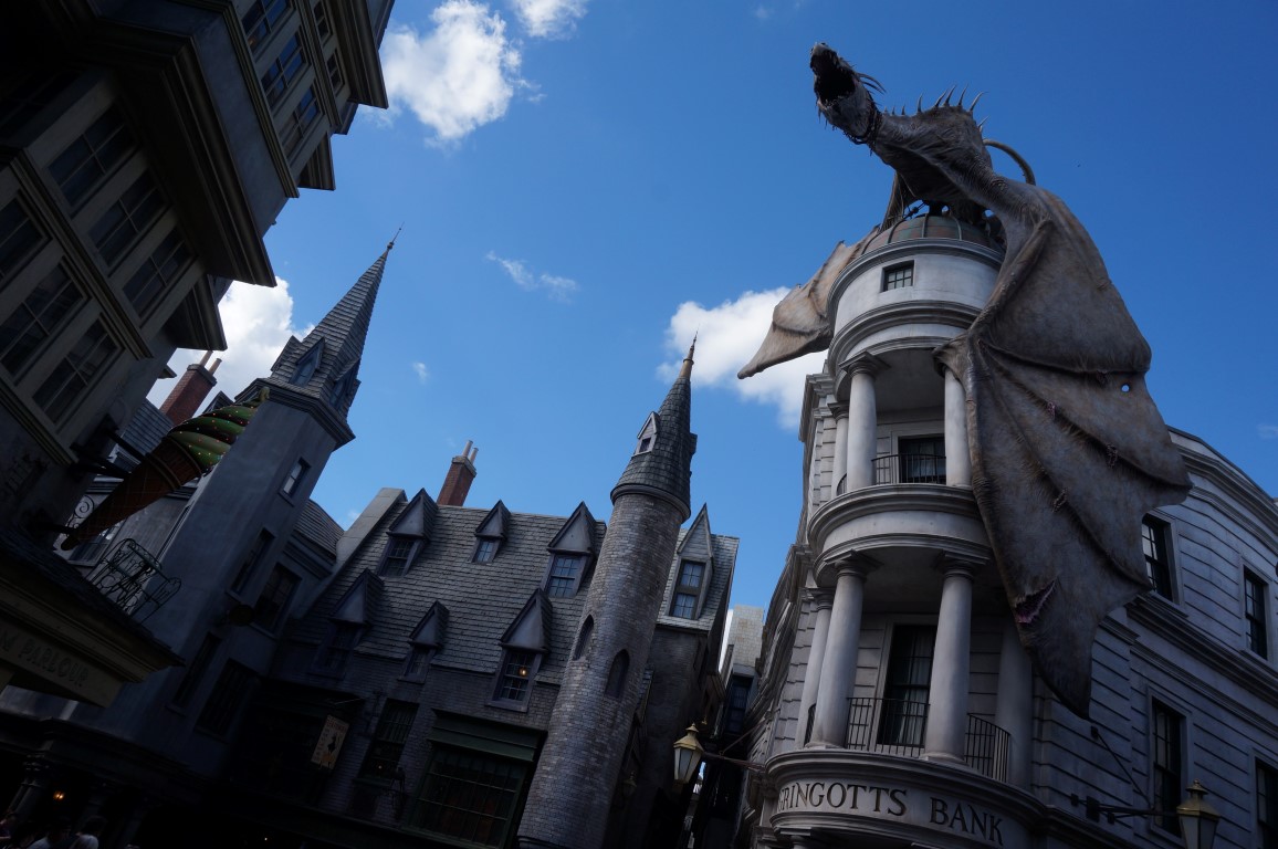 De draak is meer dan een visueel spektakelstuk; hij wijst ook de weg naar Harry Potter and the Escape from Gringotts. Dit is de hoofdattractie van Diagon Alley en hij staat tijdens ons bezoek garant voor de langste wachttijden van het hele park. We moeten vanmiddag ongeveer 40 minuten geduld oefenen, al is dat geen straf. Escape from Gringotts heeft namelijk een van de knapste wachtruimtes binnen het hele resort: de hoofdzaal van de Gringotts Bank is erg imposant en de voorshow legt het achtergrondverhaal uit.