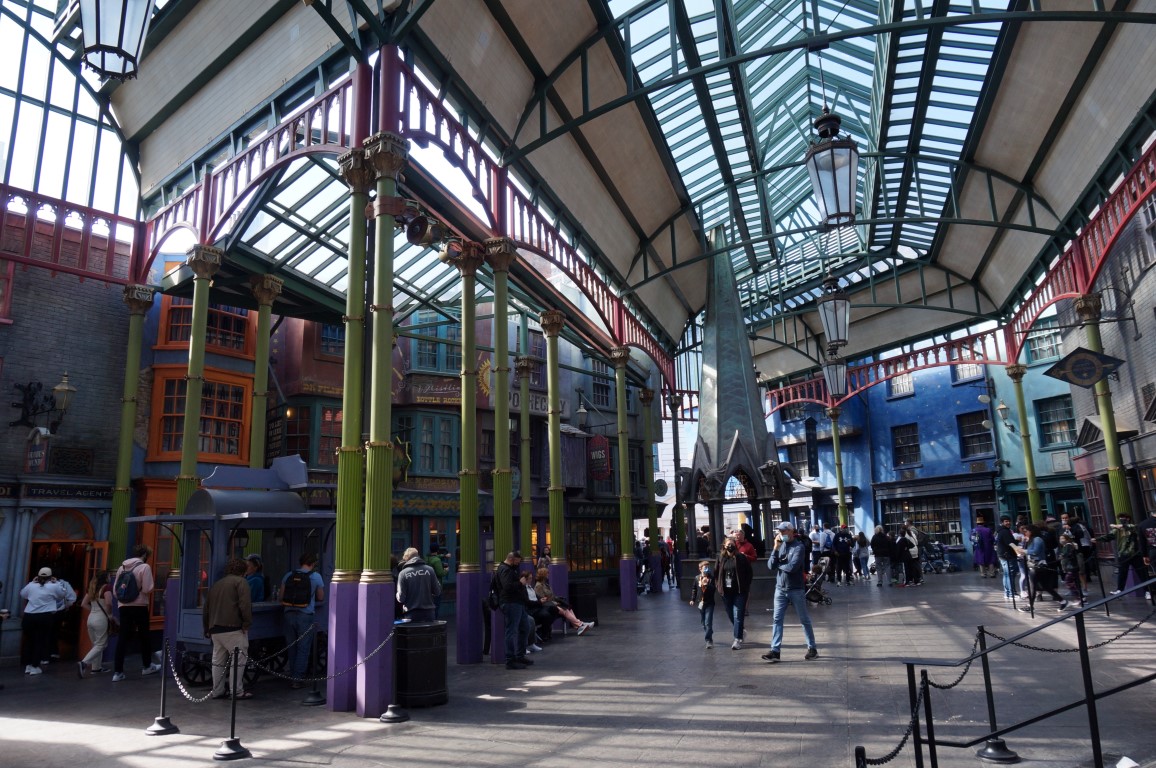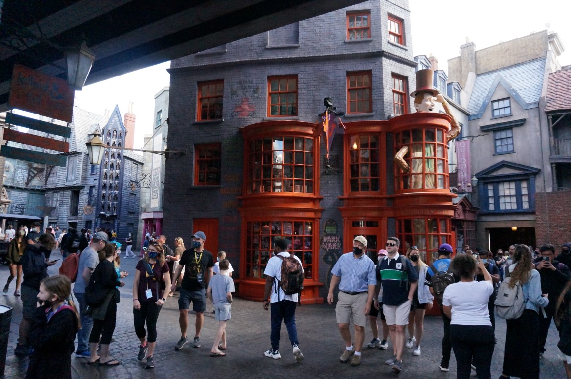 Een verpletterende indruk maakt Universal Studios Florida voorlopig niet. Gelukkig is er beterschap op komst, want we naderen Diagon Alley. Dit themagebied maakt deel uit van Universal’s iconische Wizarding World of Harry Potter en is zo mogelijk nog indrukwekkender dan het vier jaar oudere Hogsmeade in Islands of Adventure. Wat Diagon Alley zo fantastisch maakt, is het feit dat je hier echt op verkenning kan gaan. Je ziet aanvankelijk niets meer dan een statige gevelrij uit Londen, maar daarachter ontplooit zich een wereld vol magie en ongelooflijke details. Hoewel Disney algemeen beschouwd wordt als de ultieme koploper in het creëren van immersieve belevenissen, presteert Diagon Alley minstens op een gelijkwaardig niveau. Iedere tegel, iedere winkeletalage en ieder schoorsteentje staat er met een reden. Er is ontzettend veel te zien, dus het is enigszins jammer dat vele bezoekers enkel oog hebben voor die beruchte draak. Toegegeven… Ook ik heb met een gezonde spanning staan wachten tot hij weer vuur ging spuwen, maar Diagon Alley is zoveel meer dan dat.