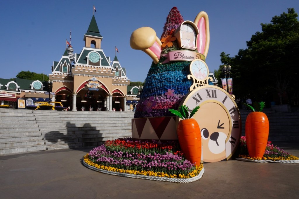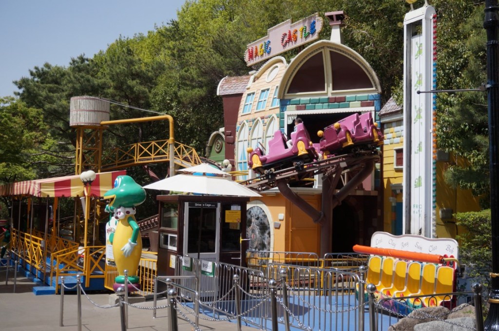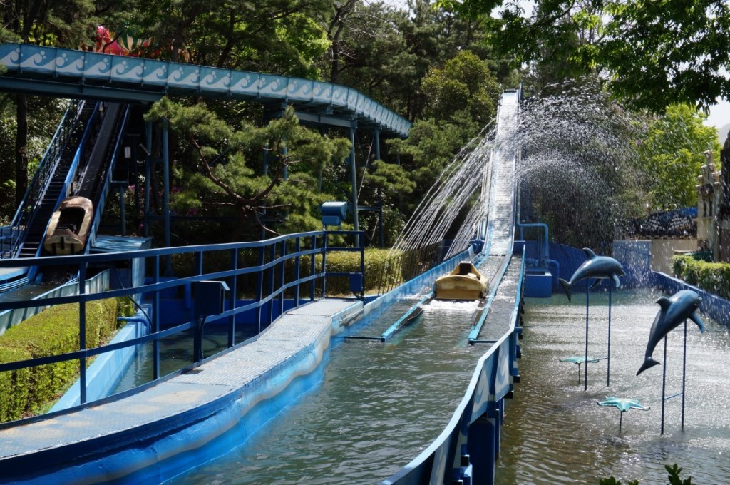 Toen we gisteren Seoul ontdekten, leek het haast herfst. De lucht was grijs en regelmatig viel er een flinke plensbui. Vandaag mogen we, daarentegen, van ultiem lenteweer genieten. Het is zelfs zo zonnig dat we met plezier een ritje op Flume Ride maken. Deze boomstammenbaan ziet er een stuk simpeler uit dan de exemplaren die je uit Europese themaparken kent. Ik vermoed dus dat Mack en Intamin hier niks mee te maken hebben, maar dat E-World een goedkopere bouwer inschakelde. Qua lay-out hoef je dan ook geen wonderen te verwachten. Hoewel de baan twee lifthills telt, is er namelijk slechts één afdaling van bescheiden proporties. Nat word je daar niet van, al zorgen enkele strategisch geplaatste fonteinen alsnog voor enige verfrissing.