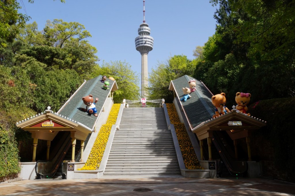 Dat E-World een zeer compleet vrijetijdspark is, staat vast. Naast het attractiepark, de bescheiden zoo en de sprookjesachtige tuinen staat hier namelijk ook een ruim 200 meter hoge panoramatoren: de zogeheten Daegu 83. Het ding is niet alleen een landmark voor het park, maar het werd ook een symbool voor de stad Daegu. De toren claimde een prominente locatie op de heuveltop, dus tijdens heldere dagen zijn waanzinnige vergezichten gegarandeerd. We merken daarboven nogmaals hoe uitgestrekt Daegu is en we krijgen uiteraard ook een schitterend overzicht over E-World. Het is opmerkelijk dat Daegu 83 in feite een aparte toeristische attractie is, die los van het park opereert. Ons ticket omvat weliswaar een bezoek aan beiden, maar het is niet verplicht om voor deze combi-formule te kiezen. Dat E-World en Daegu 83 nauw met elkaar verbonden zijn, spreekt echter voor zich. Men bouwde namelijk een tweede parkingang ter hoogte van het torencomplex en er loopt eveneens een (ouderwetse) kabelbaan tussen Daegu 83 en het park.