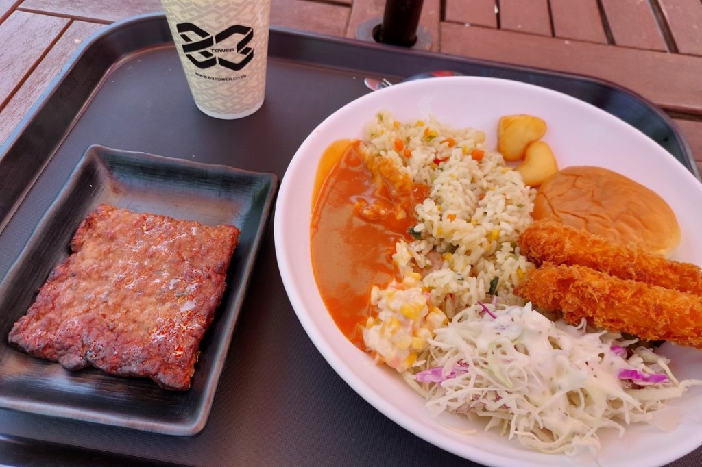 Wanneer je iets wil eten, biedt E-World een overvloed aan opties. Langs de wandelpaden staan er een heleboel kraampjes, maar er zijn ook vestigingen van Koreaanse fastfoodketens en enkele zelfbedieningsrestaurants. Onze keuze valt op de Carnival Food Fair, waar we de bestelling moeten doorgeven via een automaat die alleen in het Koreaans beschikbaar is. Toch moet je als toerist niet vrezen dat de maaltijd automatisch volledig in het water valt. Net zoals men dat in grote delen van Azië doet, is het ook in Korea gebruikelijk om de samenstelling van gerechten te verduidelijken aan de hand van foto’s of (in plastic nagemaakte) voorbeeldborden. M’n portie gebakken rijst met gefrituurde garnalen blijkt overigens heerlijk en overstijgt moeiteloos het gemiddelde niveau van Europese pretparkmaaltijden.