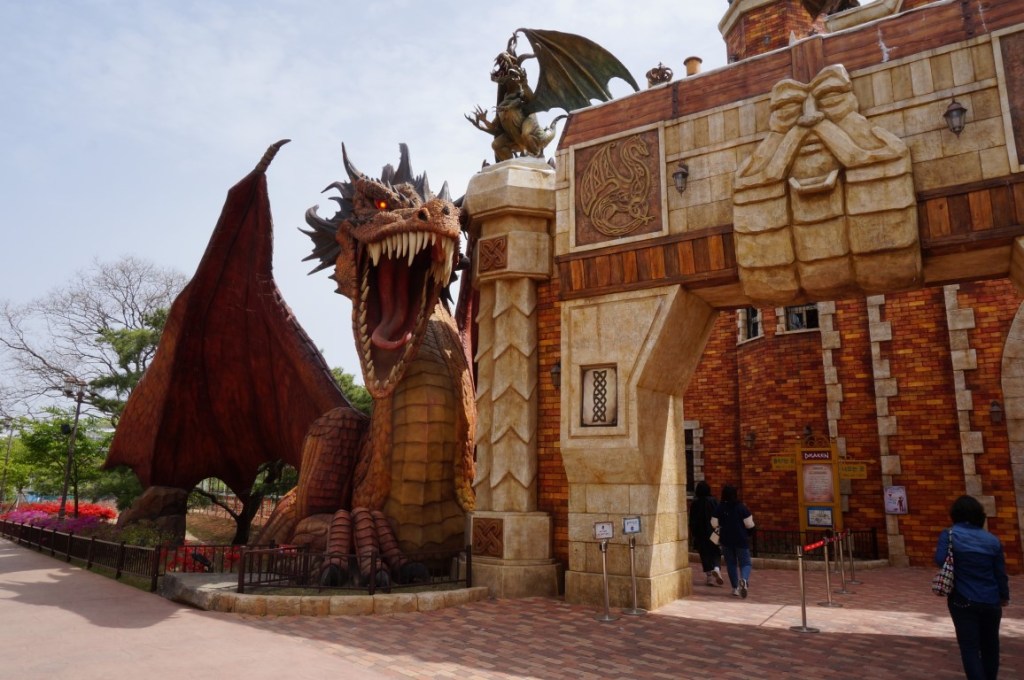 Het lijkt geen al te drukke dag te worden in Gyeongju World. Er zijn weliswaar enkele bussen schoolkinderen aanwezig, maar verder is de opkomst laag. We kunnen dus in alle rust het park ontdekken en starten in Draken Valley, waar draken en mythologische creaturen centraal staan. Het feit dat Draken Valley nog relatief nieuw is, wordt trouwens weerspiegeld in de schoonheid ervan. De toegangspoort van het themagebied is prachtig en ook de andere gebouwen werden met veel oog voor detail ontworpen.