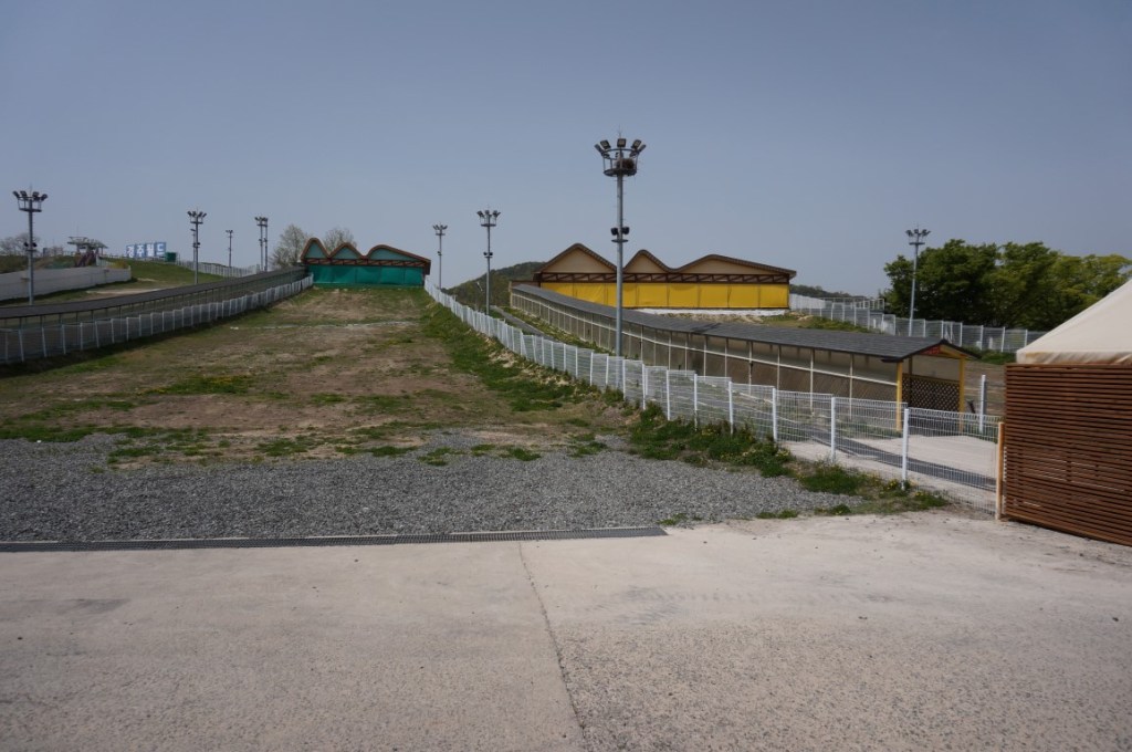 Het is voor Zuid-Koreaanse themaparken niet ongewoon om een skipiste in het aanbod te hebben. Ik heb het niet over indoor skipistes, maar wel over hellingen in de buitenlucht. We wandelden al langs een dergelijk mini-skiresort in E-World en ook Gyeongju World heeft een eigen versie. Het is bijzonder om zoiets in een pretpark te zien, al spreekt het voor zich dat er tijdens deze warme lentedag geen beweging te bekennen is. Rondom het reuzenrad is er evenmin activiteit waar te nemen, maar dat heeft een andere reden. Deze opvallende verschijning werd in 2022 namelijk buiten werking gesteld. Gyeongju World verduidelijkt door middel van een infobordje dat men het rad voorlopig wel laat staan, als een soort fotolocatie. Als tijdelijke oplossing is dit prima, al verkies ik een werkend reuzenrad boven een stilstaand exemplaar. Hopelijk komt er op termijn een vervanger.
