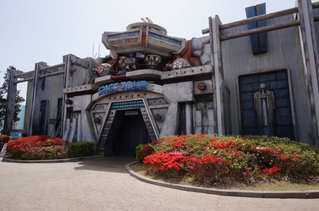 In de zuidelijke uithoek van Gyeongju World wordt onze aandacht getrokken door een industrieel aandoend gebouw met aanzienlijke afmetingen. Space Tour staat er in grote letters op de gevel. Jammer maar helaas: de deuren blijven dicht. We kunnen dus niet zelf ontdekken wat er binnenin te beleven valt, maar het internet leert ons dat dit ooit een indoor coaster was. De ride startte zijn leven in openlucht, onder de naam Jungle Mouse. Op fotomateriaal zie ik een krakkemikkig ogende familieachtbaan die het evenwicht tussen een wild mouse en een Zierer Flitzer zoekt. In 2006 werd de coaster dan overdekt en voegde men het spacy thema toe. Een tiental jaar later ging het licht echter definitief uit voor Space Tour… en da’s zonde. Gyeongju World heeft immers amper overdekte ervaringen, dus zo’n indoor-attractie zou hier een grote meerwaarde leveren. Misschien kan het gebouw ooit gerecycleerd worden voor een toekomstige dark ride?