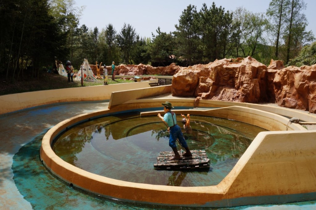 Gyeongju World is de thuishaven van de klassieke drievuldigheid der waterattracties. Die bevat een shoot-the-chutes, een log flume en… een rapid river. Helaas komen we bij Grand Canyon Exploration wederom voor een gesloten poort te staan. In dit geval vind ik dat jammer, want deze raftingbaan ziet er verrassend tof gethematiseerd uit. De clichématige Indianenbeelden zijn weliswaar niet woke, maar we zien daarnaast ook flinke rotsformaties en een indrukwekkende toegangspoort. Dat ze in Gyeongju World iets van decoratie kennen, is inmiddels wel duidelijk. Dat wordt trouwens nogmaals bevestigd bij onze volgende attractie…