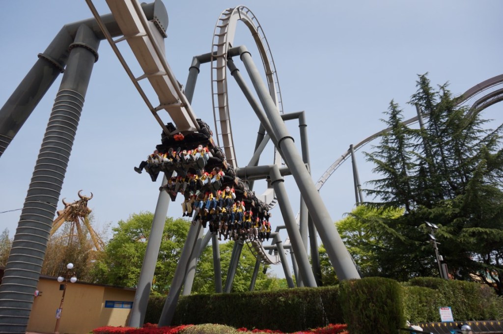 Gyeongju World is voorlopig het enige Koreaanse pretpark dat inkopen deed bij de coastergoden van Bolliger & Mabillard. In tweevoud, zelfs. Naast Draken vinden we hier immers ook Phaethon, die tijdens de inleiding reeds vernoemd werd. Deze inverted coaster opende in het jaar 2007 en rond die tijd is Gyeongju World wellicht op m’n radar verschenen. De knappe theming die ik me van de foto’s herinner, blijkt anno 2023 nog intact. De ingang wordt gemarkeerd door een impressionant paardensculptuur en het stationsgebouw werd vormgegeven als een monumentale Griekse tempel. De onsubtiele verwijzing naar Universal’s Dueling Dragons (“Choose Thy Fate”) is misschien een beetje misplaatst, al merkt 99,9 procent van de bezoekers dat wellicht niet op.