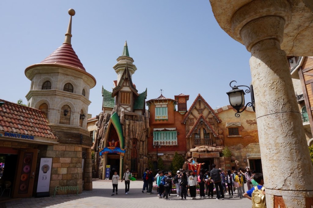 In het report over E-World sprak ik al over de Foreigner Discount, waar vele Zuid-Koreaanse parken maar wat graag mee uitpakken. In Gyeongju World vinden we helaas geen korting voor buitenlandse bezoekers, maar er is wel een voordelig tarief voor gasten die in de nabije omgeving overnachten. En inderdaad: nadat we onze boekingsbevestiging tonen, wordt ons ticket plots 13.000 won (ongeveer 9 euro) goedkoper. We betreden Gyeongju World dus met een goed gevoel, wat mede aan het zomerse weer te danken is. Bovendien heet het park ons welkom met een prachtige inkomzone vol prettig ogende façades. Neem echter liever geen kijkje áchter die gevels. Het interieur van de grote souvenirshop is immers kil en de zaak wordt verlicht door spierwitte TL-lampen. Weg sfeer.