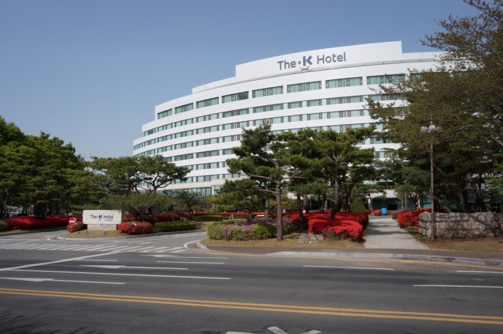 Net zoals Alton Towers en Avonturenpark Hellendoorn werd Gyeongju World vernoemd naar z’n geografische locatie. Het park ligt immers nabij Gyeongju (spreek uit als kjong-djoe), aan de oostkust van Zuid-Korea. Deze stad is een culturele hotspot en biedt heel wat bezienswaardigheden. Aangezien er ook een reusachtig nationaal park in de directe omgeving ligt, trekt Gyeongju dus behoorlijk veel bezoekers. Een van de toeristische centra is Bomunho Lake, ten oosten van de stad. De omgeving van het meer werd bekend dankzij z’n tempels, wandelroutes en kersenbloesems. Er zijn tal van accommodaties en onze keuze valt op The K Hotel. Eerlijk gezegd: we zijn blij dat we slechts voor één nachtje blijven. De foto’s die ik online vind, stellen de staat van dit hotel namelijk wel erg rooskleurig voor. In realiteit beleven we een langgerekte flashback naar de jaren negentig, maar helaas niet in de goede zin. De ligging van The K Hotel is echter excellent. Vele kamers bieden zicht op een oogstrelende pagode en de ingang van Gyeongju World ligt op amper 15 minuten wandelen.