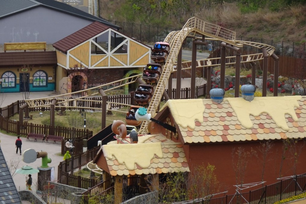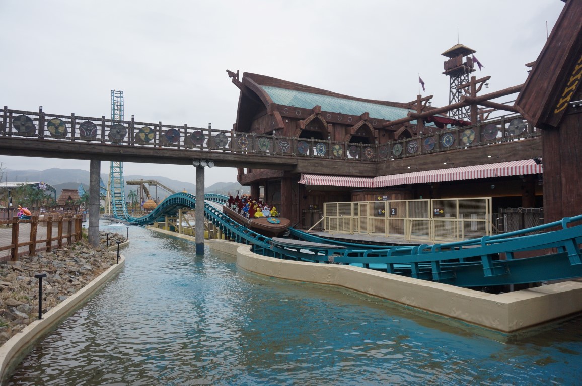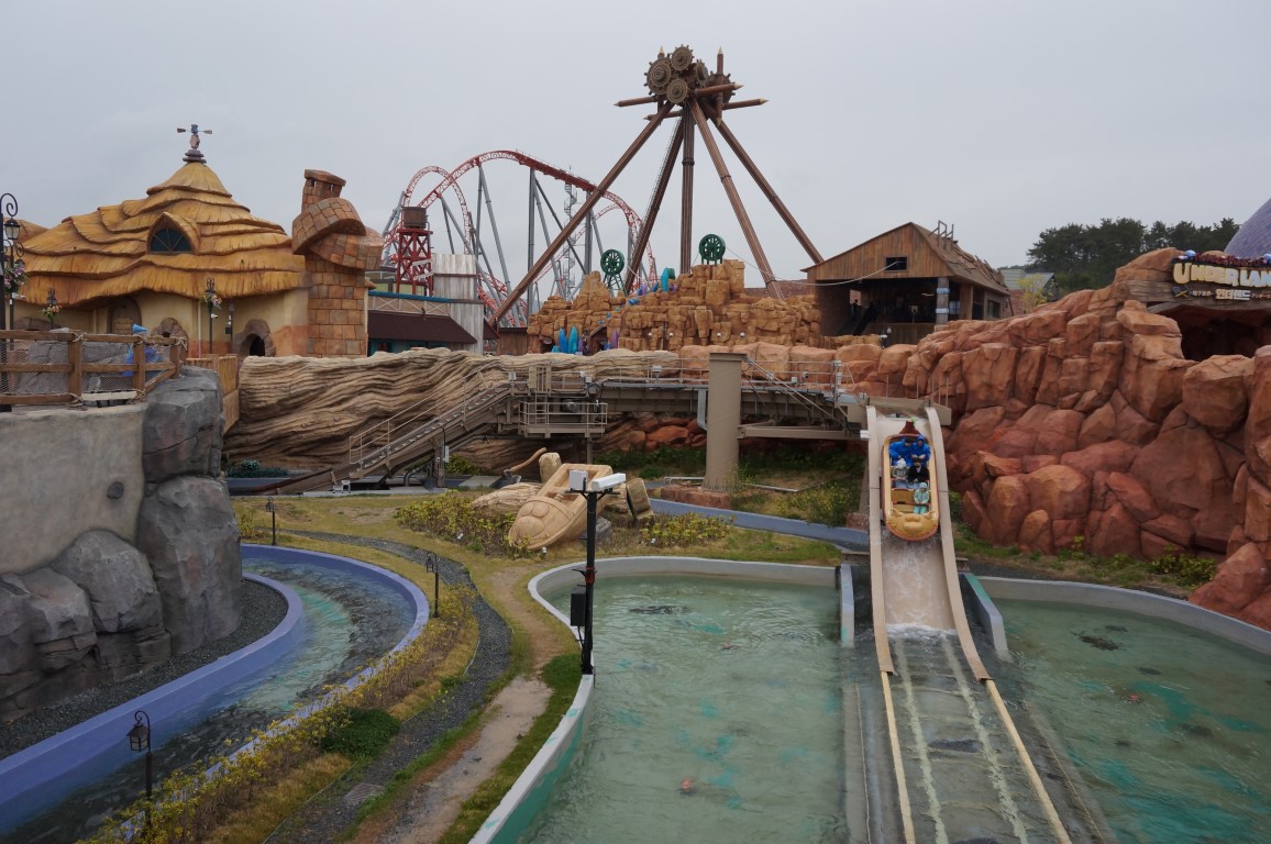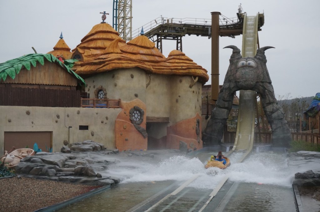 Modieus is zo’n plastic poncho allerminst, maar ik zie er ook de voordelen van. Zo kunnen we vandaag zonder veel gedoe de plaatselijke waterattracties uitproberen. Een van die waterattracties ligt vlak achter de parkingang en gaat door het leven als Ogre’s Flume. Deze ride trekt niet alleen de aandacht omwille van z’n prominente locatie, maar ook qua aankleding ziet hij er prima uit. Het station is leuk aangekleed en ter hoogte van de laatste afdaling staat een indrukwekkend ogerstandbeeld. Het had visueel waarschijnlijk nog prettiger geweest indien men de volledige lift- en dropconstructie in een rotsformatie had geïntegreerd, maar ik kan ook de huidige vormgeving wel smaken. Verder is dit trouwens een vrij standaard flume van ABC Rides. De lay-out start met een kort vaargedeelte, gevolgd door een kleine en een grote afdaling. De laatste drop is verrassend steil en resulteert in een stevige splash. Ik heb er bijgevolg absoluut geen spijt van dat ik daarnet 3.000 won investeerde in die poncho.