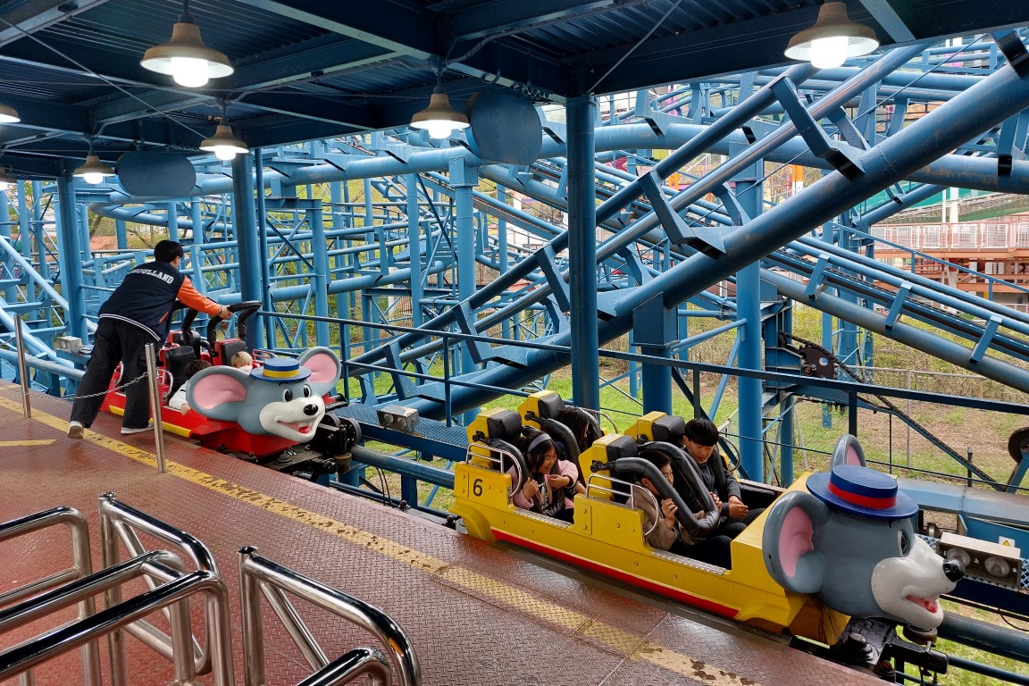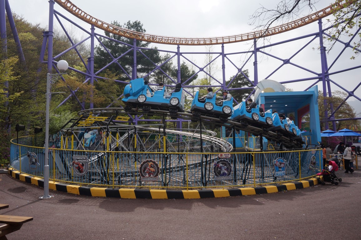Tobot is een Zuid-Koreaanse animatieserie met auto’s die zichzelf kunnen omtoveren in robots. Een soort Transformers voor kinderen, zeg maar. De reeks schijnt razend populair te zijn en daar speelt SeoulLand handig op in met Tobot Train. We spreken over een powered coaster van Zamperla met een dubbele helix. Qua thema zijn vooral het station, het voertuig en een metershoog robotstandbeeld noemenswaardig, maar verder ziet Tobot Train er tamelijk kermisachtig uit. Hetzelfde geldt voor Tikitoc Train, die even verderop staat. Dit is een Wacky Worm met een schattig vormgegeven trein en dito station, maar de hardware heeft z’n beste tijd gehad. Het ding piept en kraakt langs alle kanten, en een laagje verf zou heus geen kwaad kunnen. We zijn dus niet onder de indruk, maar Tikitoc Train bezorgt ons wel een coaster-bingo, yay!