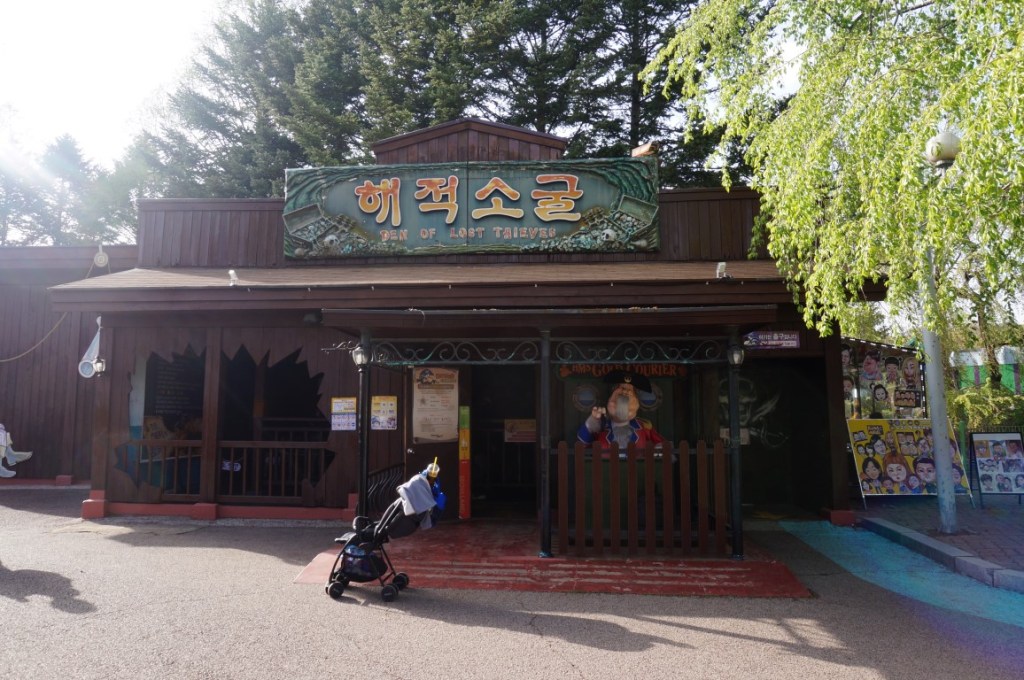 We eten een uitstekende Donkkaseu (een typisch Koreaans fastfoodgerecht, bestaande uit een gepaneerd varkenslapje, zoete saus en rijst), waarna we het kleinste themagebied van SeoulLand ontdekken. Ik heb het over Adventure Land, dat uit een viertal attracties bestaat. Het schommelschip en de kartingbaan laten we aan ons voorbij gaan, maar bij Den of Lost Thieves staan we met plezier een kwartiertje in de rij. Dit is namelijk een dark ride, een attractietype dat we tijdens de afgelopen week ontzettend gemist hebben. Helaas blijkt al snel dat Den of Lost Thieves niet meteen een hoogvlieger is. De rit is immers erg kort en de scènes bestaan voornamelijk uit 2D-decors. Ik ben doorgaans geen fan van laserguns in dark rides, maar in dit geval biedt het interactieve schietspel weldegelijk toegevoegde waarde. Door mezelf op de doelen te focussen, valt m’n oog namelijk minder op de goedkope theming.