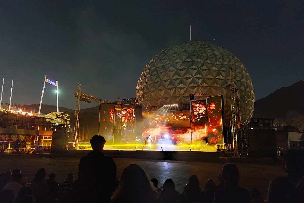 De infrastructuur rondom het park deed me aan Magic Kingdom denken, terwijl de zilveren bol herinneringen aan EPCOT opriep. En de vergelijking met Disney stopt daar niet. Ook de naamgeving van de verschillende parkzones werd onsubtiel door Disney geïnspireerd. Op het parkplan spot ik namen als Adventure Land, Fantasy Land en Tomorrow Land. Dat laatstgenoemde gebied lijdt trouwens aan hetzelfde kwaaltje als Tomorrowland in Orlando en Anaheim: het is in de loop der jaren een soort Yesterdayland geworden. We zien enkele flat rides (onder andere een Ranger en een Space Shot) met een vreselijk gedateerd uiterlijk, maar het dieptepunt is wellicht Time Machine 5D 360. Hoewel die naam veel gegoochel met cijfers en dimensies bevat, belanden we in een triest cinemazaaltje waarin twee nietszeggende kortfilms vertoond worden. Het enige dat ik nog best grappig vind, is de vormgeving van het gebouw. Deze 3D-film wordt immers afgespeeld in een reusachtige UFO-constructie.
