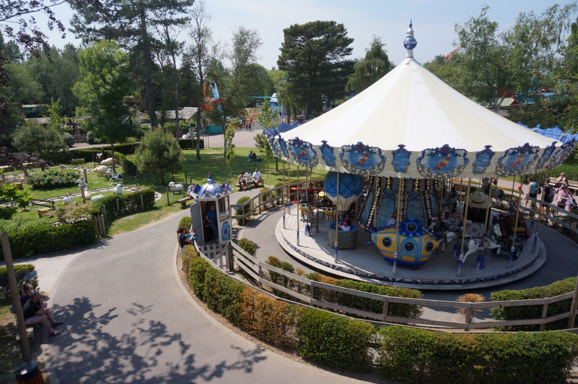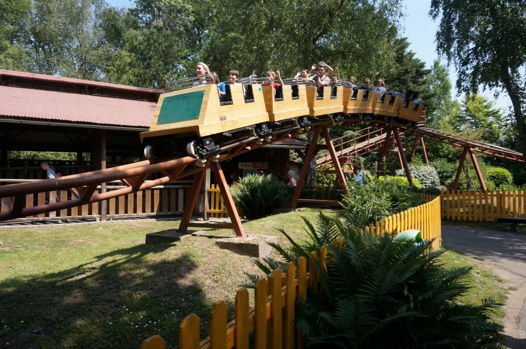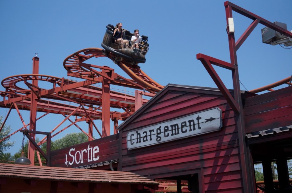 Het westerngebied van Parc Bagatelle bestaat uit heel wat origineel gedecoreerde familieattracties. We zien onder andere een vliegend tapijt met huifkarthema en Les Woodies, een zogenaamde Sidecar van de Italiaanse constructeur Technical Park. De hoofdattractie van deze zone is echter Famous Jack, een spinning coaster van Reverchon. De lay-out van deze verplaatsbare achtbaan is herkenbaar, want je ziet ‘m veelvuldig verschijnen op Belgische en Nederlandse kermissen. Qua ritervaring weten we dus dat het geen hoogvlieger is. Op een tweetal afdalingen na, bestaat de baan namelijk grotendeels uit simpele haarspeldbochten. Toch wil ik Bagatelle een complimentje bezorgen, want het station van Famous Jack ziet er prima uit. Er werden zelfs twee houten torentjes gebouwd waar de voertuigen tijdens de rit doorheen razen. Leuk gedaan.