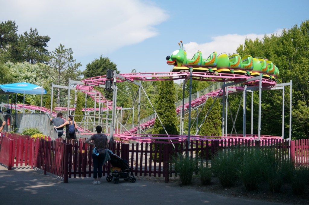 Bagatelle is een regionaal amusementspark en daar hoort geen toegangspoort van monumentale proporties bij. We betreden het park dus langs een eerder kleinschalig ingangetje, waarna we op een fijn ingericht plein belanden. Achter de ingang staat een schattig fonteintje en even verderop fungeert zweefmolen Twist’Air als visuele blikvanger. De meeste andere attracties in deze zone zijn trouwens op de allerjongste bezoekers gericht. We spotten onder meer een piepklein schommelschip, een kinderboerderij, een verbazend knap vormgegeven carrousel en een überschattige rondrit met roze varkentjes. Onze aandacht wordt echter vooral getrokken door Le Kid’z Coaster, een Wacky Worm van SBF Visa Group. Vaak worden zulke kinderachtbanen geleverd met een gigantische appel en lampjes in de vorm van kleurrijke bloemen, maar in Bagatelle is er van zulke thema-elementen geen sprake. Le Kid’z Coaster ligt er bijgevolg wel erg kaal bij, en da’s best jammer.