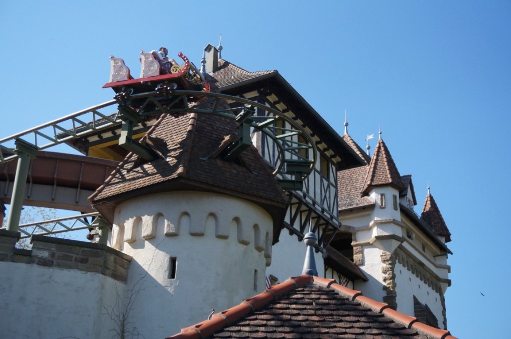 Burg Rauhe Klinge is misschien wel het bekendste beeld van Tripsdrill. Dit witgekalkte kasteel met middeleeuwse trekjes is de thuishaven van twee populaire attracties. Dat zijn G’Sengte Sau en Badewannen-Fahrt zum Jungbrunnen. Het is een mooie zomerdag, dus het verbaast ons niet dat deze waterattractie een van de enige noemenswaardige wachtrijen van de dag oplevert. We staan hier een dertigtal minuten aan te schuiven, maar dat is Badewannenfahrt absoluut waard. We spreken immers over een van Europa’s meest kwalitatieve log flumes, inclusief drie afdalingen en een verrassend origineel thema. Waarschuwing voor de gevoelige kijkers: je vaart in deze attractie naar de bron van de eeuwige jeugd en daar hoort blijkbaar een portie vrouwelijk naakt bij.