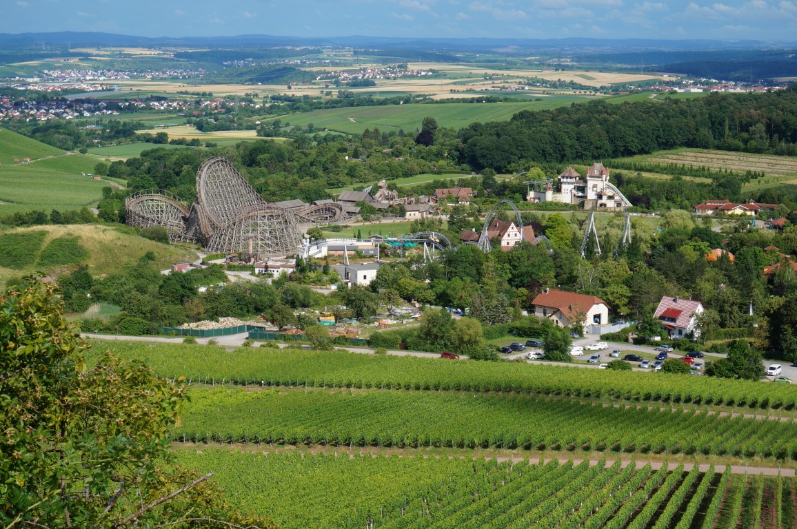 Welkom in Cleebronn. Dit plaatsje ligt tussen eindeloze wijngaarden en licht glooiende akkers, op een kleine veertig kilometer van de metropool Stuttgart. Het leven lijkt hier kalm, maar toch heeft Cleebronn ook een spectaculaire karaktertrek. Aan de voet van de Michaelsberg ligt namelijk een pretpark met maar liefst zes achtbanen. Mag ik jullie meteen aanraden om die Michaelsberg eens te beklimmen? Bovenop deze heuvel staat niet alleen een prachtige jeugdherberg, maar je hebt er ook een imposant uitzicht over dat pretpark. Er staat aan het uitkijkpunt een paneel dat je het Schönste Weinsicht belooft, maar onze ogen worden toch vooral naar die fotogenieke achtbanen getrokken. Een mooiere opwarmer voor een dagje Tripsdrill bestaat niet.