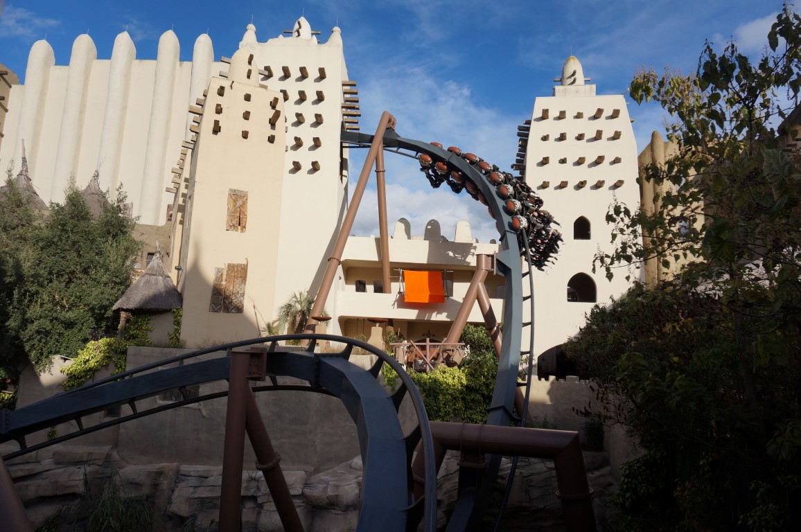 De weg van Berlijn naar Afrika is kort… in Phantasialand, dan toch. We steken een houten wandelbrug over en belanden in een totaal andere wereld. Themagebied Deep in Africa bestaat uit tropische vegetatie, exotisch houtsnijwerk en gezellige straatjes vol authentieke architectuur. Daarnaast is er de Adventure Trail, een verrassend uitgebreid hindernissenparcours dat dwars door de jungle loopt. Deze Adventure Trail levert trouwens ook onbetaalbare uitzichten op Black Mamba. Ik heb de indruk dat deze B&M inverted coaster tegenwoordig een beetje ondergewaardeerd wordt. Iedereen heeft het over F.L.Y. en Taron, maar Black Mamba krijgt veel minder aandacht. Dat is jammer. Deze schoonheid werd immers perfect in het landschap geïntegreerd en de rit staat nog steeds garant voor een stevige thrill. Het blijft briljant om met die opzwepende drums het station uit te rijden en vervolgens vier pijlsnelle inversies te beleven. En oh… wil je jezelf eens oud voelen? Weet dan dat Black Mamba er inmiddels al achttien jaar staat!