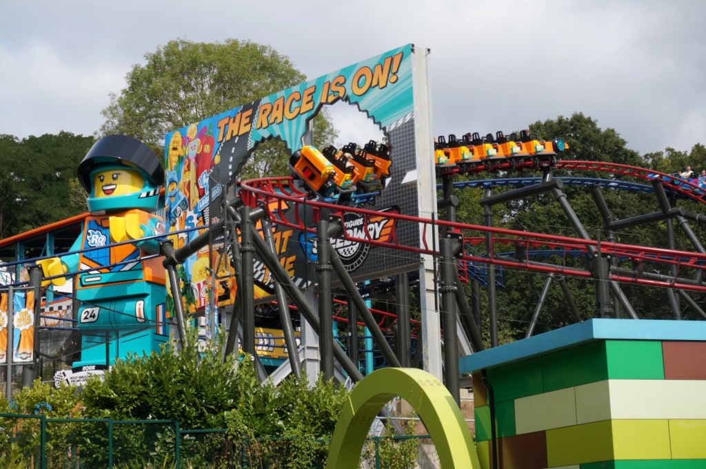 De rest van het park ligt een stuk lager, dus we gaan afdalen. Dat kan eventueel met behulp van The Hill Train, die shuttlevervoer tussen het hoger en lager gelegen parkgedeelte verzorgt. Toch zijn de rijen voor deze treinrit ‘s ochtends behoorlijk lang, dus het lijkt erop dat je te voet haast altijd sneller bent. Ook wij opteren voor de wandeling, die ons naar het zogenaamde Bricktopia brengt. Dit themaland bevat niet alleen een 4D-bioscoop en een verbazend populaire monorail, maar het is ook de thuishaven van een grote nieuwigheid. Legoland Windsor opende in 2024 namelijk Minifigure Speedway, een Dueling Reverse Coaster van de Duitse constructeur Zierer. Beschouw het gerust als Zierers antwoord op Tweestryd in Wildlands, want deze dubbele achtbaan doet nagenoeg hetzelfde. Twee treinen beklimmen eerst simultaan een veertien meter hoge lifthill, waarna het traject zowel voor- als achterwaarts afgelegd wordt. Qua rit is het niets bijzonders en ook qua thema hoef je geen wonderen te verwachten. Het negen meter hoge minifigure Roxie vormt een mooie eyecatcher, maar het station en de baan zijn verder tamelijk kaal.