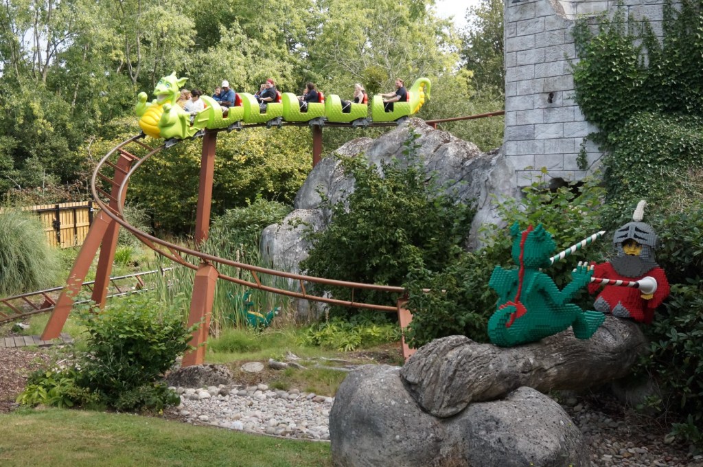 M’n oriëntatievermogen is doorgaans prima, maar ik moet toegeven dat ik in Legoland Windsor soms de weg een beetje kwijt raak. Het park bestaat uit heel wat kronkelende wandelpaden en in themagebied Knight’s Kingdom botsen we zelfs op een doodlopende weg. Toch is er een goede reden om een bezoek te brengen aan dit middeleeuwse plein, want je vindt hier de twee oudste rollercoasters van het park. Een van die achtbanen is Dragon, een klassieker in ieder Legoland-park. Deze ervaring start telkens in een imposant kasteel dat de wachtruimte, het station en enkele darkride-scènes bevat. Na dit indoor-stuk komt de drakentrein in de buitenlucht en daar baant hij zich een weg door het achtbaangedeelte. Een groot spektakel moet je daarbij niet verwachten. Als je deze ride puur als rollercoaster bekijkt, blijkt het immers een tamme belevenis. Desalniettemin vind ik het een uitstekende familieattractie. De inleidende darkride is namelijk bijzonder sfeervol en als familieachtbaan doet Dragon exact wat hij hoort te doen. De nabijgelegen Dragon’s Apprentice is overigens een miniatuurversie van The Dragon en valt vooral op omwille van z’n schattig vormgegeven voertuig. Opvallend feitje: beide coasters werden geleverd door een totaal onbekende constructeur met de naam WGH Transportation.