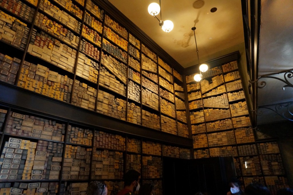Een klein weetje tussendoor: ik zie vandaag voor het eerst de vloer van Hogsmeade. Ik bezocht dit besneeuwde dorp reeds in Osaka en Orlando, maar liep er telkens schouder aan schouder met m’n medebezoekers. Hier is het echter rustig genoeg om in alle sereniteit van de omgeving te genieten… en die valt niet tegen. Hogsmeade blinkt uit in sfeerschepping en detaillering, dus het is hier aangenaam vertoeven. Dankzij de kalmte kan ik trouwens voor het eerst een Butter Beer proberen zonder ervoor aan te schuiven (het drankje blijkt oké, maar iets te zoet naar mijn smaak) en ook bij Ollivanders lopen we rechtstreeks naar binnen. Deze interactieve minishow vindt plaats in de gelijknamige toverstafwinkel. Men voert er een klein toneeltje op waarbij de juiste toverstaf aan de juiste bezoeker gelinkt wordt. Veel stelt het allemaal niet voor, maar Universal verwerkte wel enkele leuke effecten in deze ruimte. Vervolgens mogen we doorschuiven naar de eigenlijke shop, waar duizenden magic wands klaar liggen om gekocht te worden. Tovenarij of geldklopperij? Ik laat de keuze aan jou over.