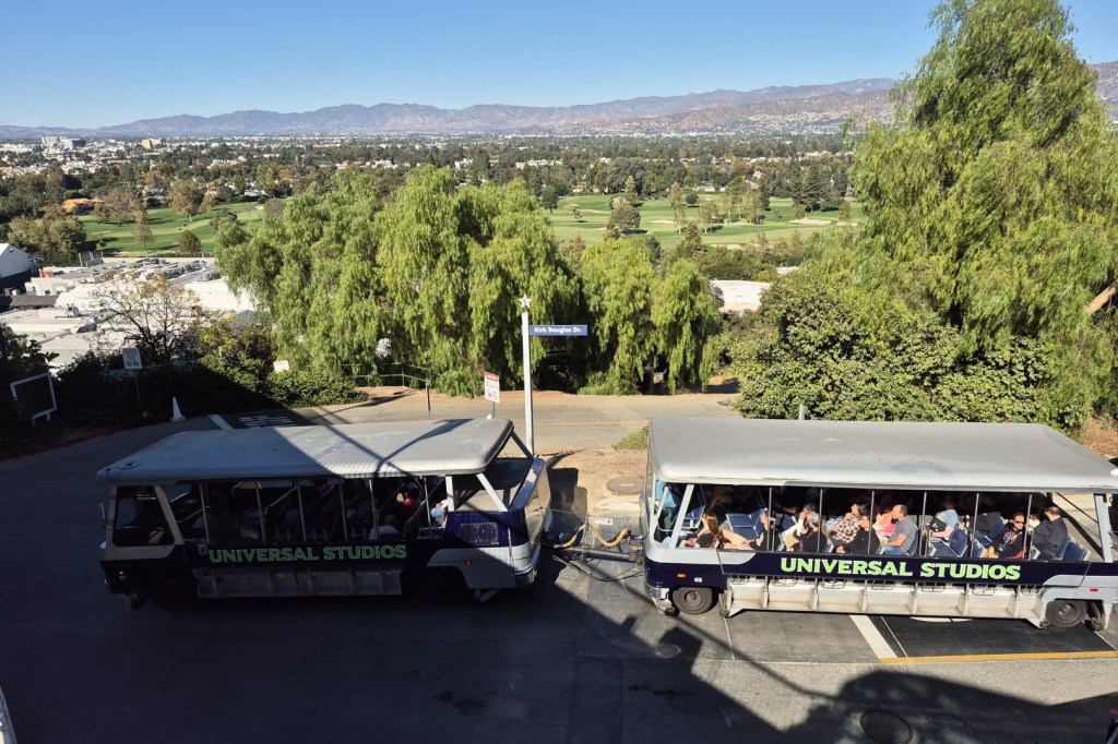 Een opvallend kenmerk van Universal Studios Hollywood is de lay-out van het domein. Het park ligt tegen een heuvelflank en werd opgedeeld in twee aparte zones. Dat zijn Upper Lot (bovenaan de heuvel) en het kleinere Lower Lot, dat je door middel van een lange reeks roltrappen bereikt. Op drukke dagen zou ik aanraden om zo vlug mogelijk de attracties in Lower Lot te bezoeken. Dit gedeelte ligt het verst van de parkingang en het grote publiek arriveert hier meestal pas ‘s namiddags. Toch merken we op deze donderdag al snel dat er van drukte geen sprake is. De Studio Tour was instapklaar en ook bij de overige attracties wordt de minimale wachttijd geafficheerd. We laten de strategische planning dus achterwege en we blijven nog even in Upper Lot.