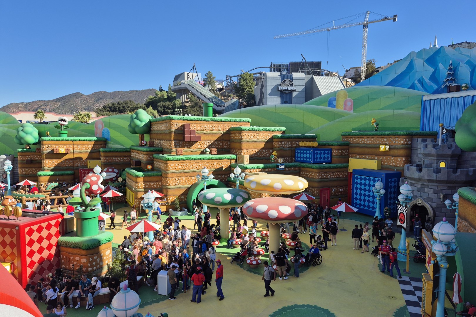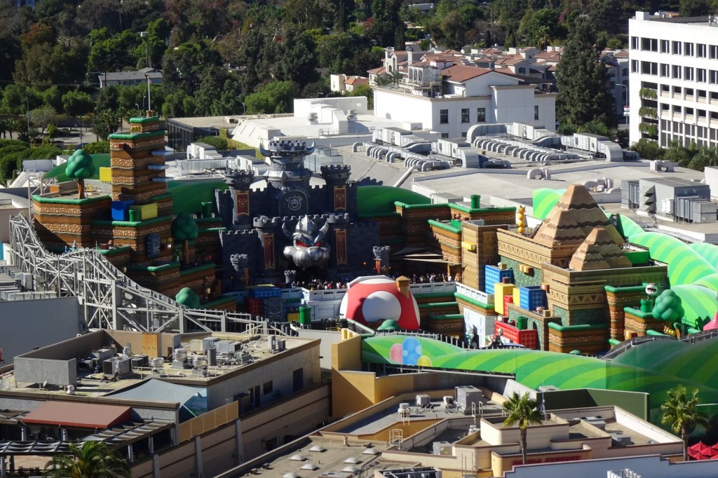 We zijn op zoek naar meer kleur en meer vrolijkheid… en Universal Studios Hollywood bedient ons op onze wenken. Vlak naast het Transformers-gebouw ligt namelijk Super Nintendo World, een van de laatste toevoegingen binnen het parkaanbod. Het gebied opende in 2023 en baseert zich op de computergames en film van de Super Mario-broertjes. En als ik het zacht mag uitdrukken: Super Nintendo World pleegt een heuse aanslag op je zintuigen. Het kleurgebruik is flitsend, er weerklinkt een opgewekte soundtrack en er zijn overal bewegende elementen te ontdekken. Er zijn weinig themagebieden die zoveel prikkels op hun bezoekers afvuren als Super Nintendo World, maar het werkt prima. Toch komt deze Californische versie van het gebied iets minder gezellig over dan de tegenhanger in Universal Studios Japan. In Osaka is Super Nintendo World compacter en bestaat de zone uit twee niveaus, wat extra diepgang creëert. Hier in Hollywood bevinden de wandelpaden zich allemaal op de begane grond, waardoor het geheel in mijn ogen wat kaler overkomt.