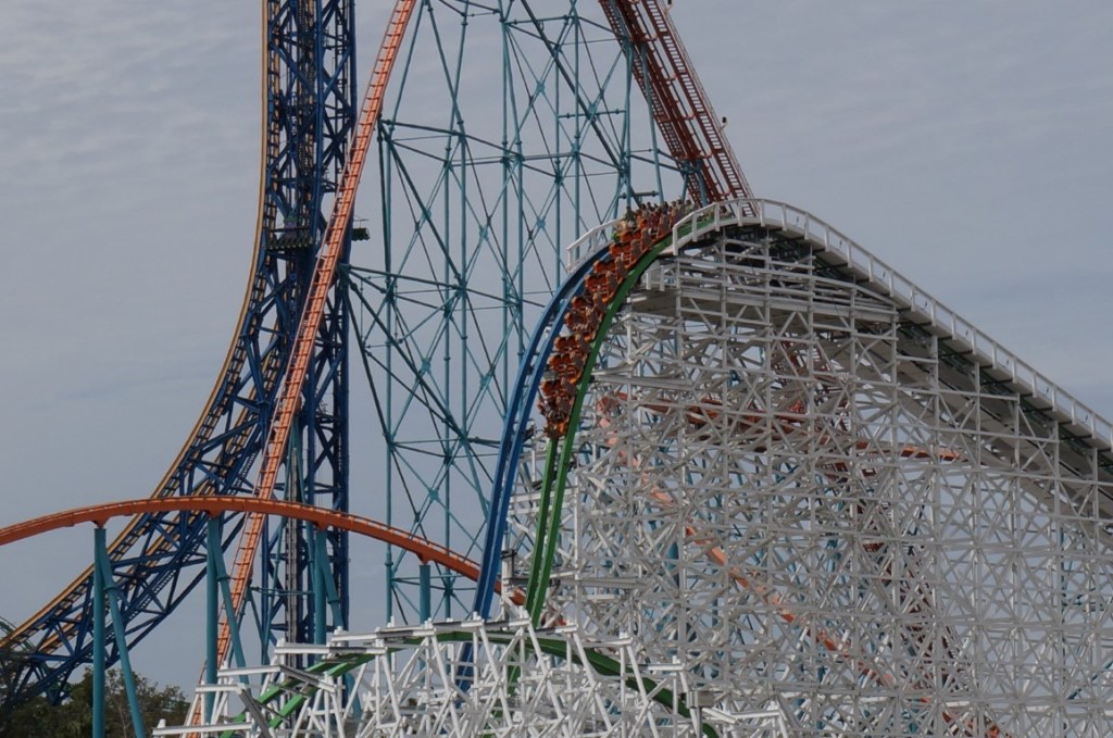 Het aanbod mag dan wel kolossaal zijn, maar ‘t is niet lastig om mijn favoriete rollercoaster van Six Flags Magic Mountain aan te duiden. Dit park is namelijk de thuishaven van Twisted Colossus, een van de meest perfecte achtbanen ter wereld. Het ding werd gebouwd door Rocky Mountain Construction. Een specialiteit van dit bedrijf is het hergebruiken van versleten houten achtbanen. Ze toveren zelfs de meest gehate martelmachines om tot instant publieksfavorieten. Hier in Six Flags werd het trucje toegepast op Colossus, een dubbele witte wooden coaster die tijdens de laatste operationele jaren een weinig memorabele ritervaring voorschotelde. Tegenwoordig is dat gelukkig anders, want z’n opvolger trakteert ons op ruim anderhalve kilometer goddelijk achtbaanvermaak. De beide tracks bevatten een zeer steile first drop, meerdere gekke bochtencombinaties en inversies. Maar wat Twisted Colossus pas echt onderscheidt van andere RMC’s, is het feit dat je de fun meteen in tweevoud beleeft. De blauwe en groene tracks zijn immers aan elkaar gekoppeld, dus iedere passagier racet twee maal. In theorie, althans. Het duellerende aspect is grotendeels afhankelijk van de dispatch-tijden in het station. En hoewel het personeel tijdens ons bezoek keihard werkt, behaalt men het gewenste resultaat heus niet altijd. Een dubbel laadstation en/of een vierde trein zouden in mijn ogen geen overbodige luxe zijn om de ultieme ervaring van Twisted Colossus te garanderen.