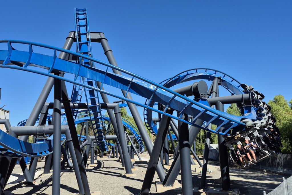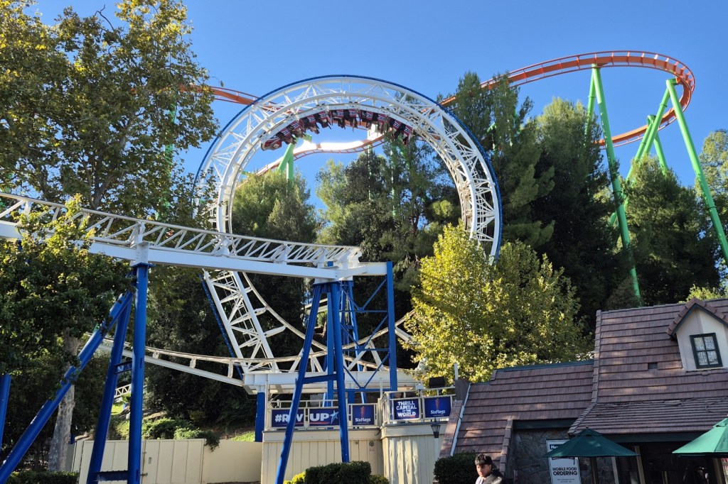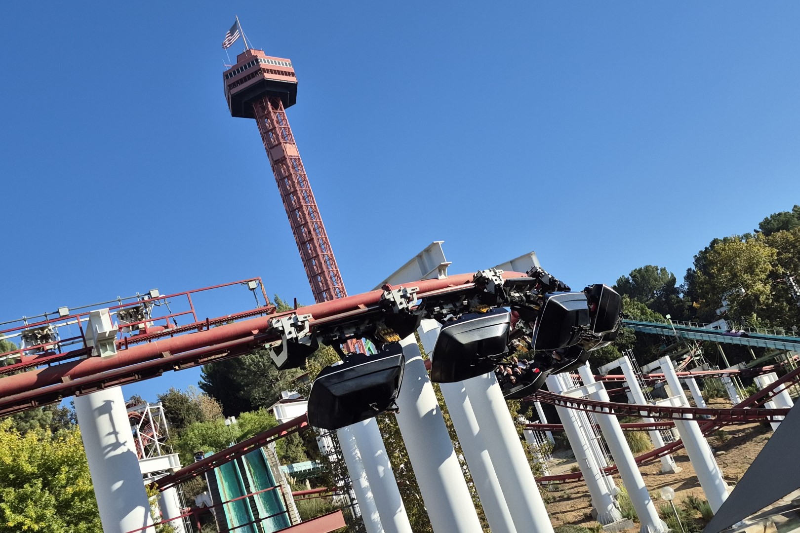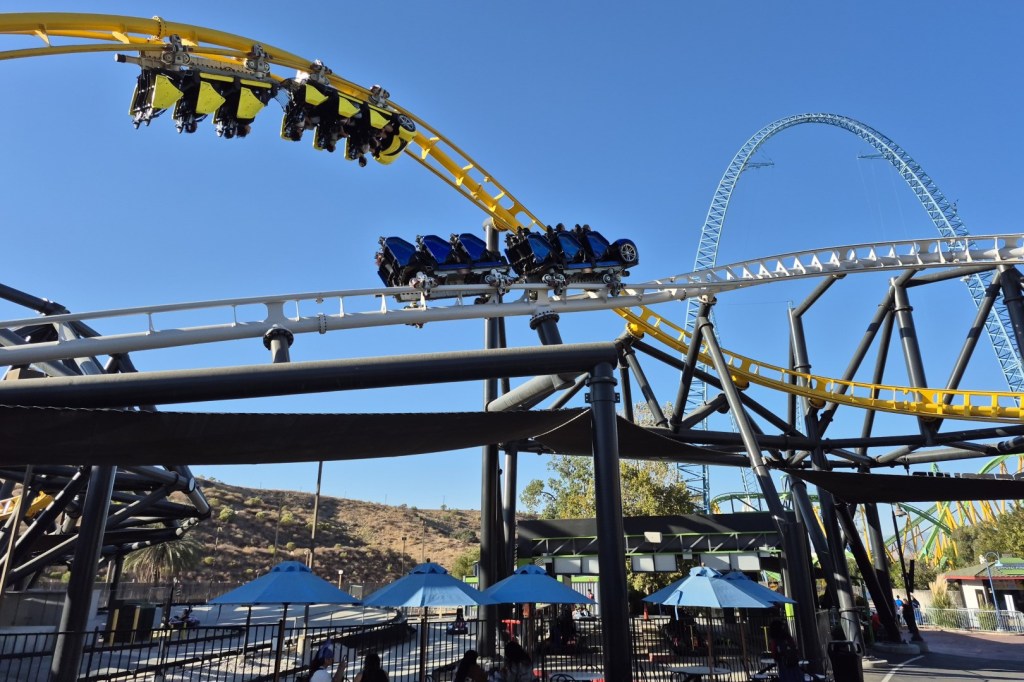 Als een willekeurig Europees pretpark uitpakt met een rollercoaster van B&M, dan wordt dat vaak de topattractie van dat park. In Six Flags Magic Mountain liggen de kaarten anders. Drie van de achtbanen die het Zwitserse bedrijf hier neerpootte, zijn naar Amerikaanse normen zelfs eerder standaard te noemen. Alleen de meest recente B&M mag bij de blockbusters gerekend worden. Ik heb het over Tatsu, die een prominente plaats op de heuveltop kreeg. Het is een plezier om wachttijdloos te herontdekken waar B&M flying coasters voor staan: souplesse en intensiteit. Die intensiteit bereikt een hoogtepunt tijdens de zogenaamde Pretzel Loop, een element dat me met een ongekende kracht in m’n zitje perst. Een vriend beschreef het gevoel ooit als ‘een vrachtwagen die over je borstkas rijdt’ en ik begrijp wat hij daarmee bedoelde. Desalniettemin reken ik zo’n ritje Tatsu bij de allerbeste achtbaanervaringen van de Verenigde Staten. De baan is comfortabel en de centrale locatie zorgt voor fantastische uitzichten over Six Flags.