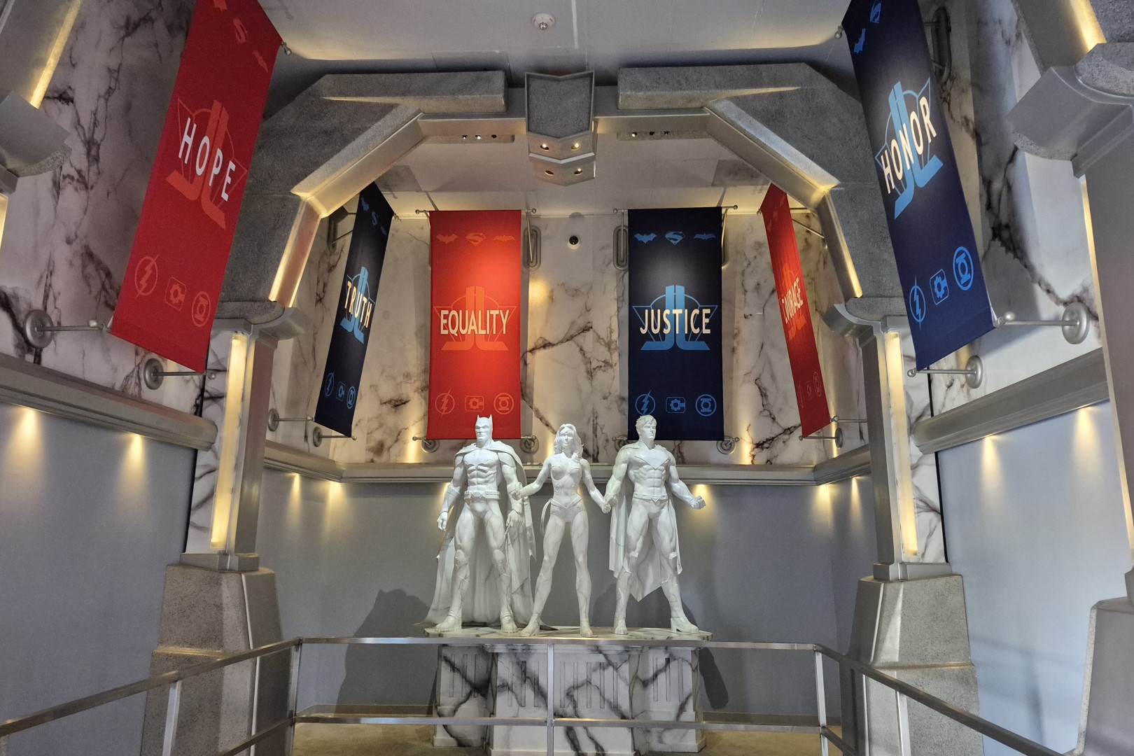 Garanties geef ik niet, maar de kans is reëel dat je Six Flags Magic Mountain in zonnige en warme weersomstandigheden bezoekt. Verkoeling vind je dan bij Roaring Rapids (een kletsnatte raftingbaan waarbij de vlotten letterlijk door muren van water varen) of Jet Stream, een terrain log flume die met zijn felgekleurde boten een heerlijke seventies-sfeer uitademt. Wij zien het vandaag niet zitten om nat te worden, maar we genieten wel even van de airconditioning bij Justice League – Battle for Metropolis. Deze interactieve darkride zorgt in meerdere opzichten voor een aangename verrassing. De façade is tamelijk imposant, de wachtruimte is prima gethematiseerd en ook de attractie zelf maakt indruk. Six Flags pakt uit met goeie animatronics, een paar toffe speciale effecten en een vermakelijk schietspel. De schermpassages zijn weliswaar niet overal even vloeiend, maar al bij al ervaren we Battle for Metropolis als een uitstekende familieattractie.