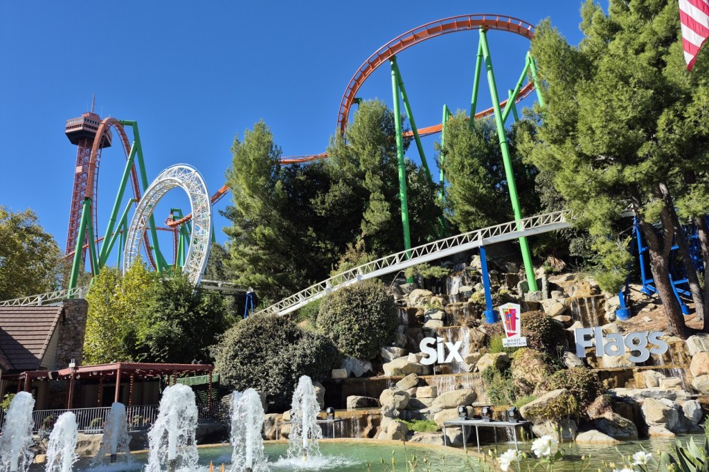 Six Flags Magic Mountain bestaat al bijna 55 jaar en vertelt bijgevolg een verhaal van oud en nieuw. De inkomzone is een plek die ons vooral aan lang vervlogen tijden herinnert. De geometrische structuur boven de ingang oogt bijvoorbeeld vreselijk ouderwets en ook de gebouwtjes aan het inkomplein kunnen een opknapbeurt gebruiken. Gelukkig zijn er ook elementen die beter bewaard bleven. Om de hoek vinden we immers een prachtige draaimolen uit 1912 en een fotogeniek vijvertje met watervallen, fonteinen en de onvermijdelijke zes vlaggen. In de achtergrond spotten we dan weer twee rollercoasters die ieder op hun eigen manier legendarisch zijn. Ik heb het over de moderne flying coaster Tatsu en een helderwit stuk antiek.