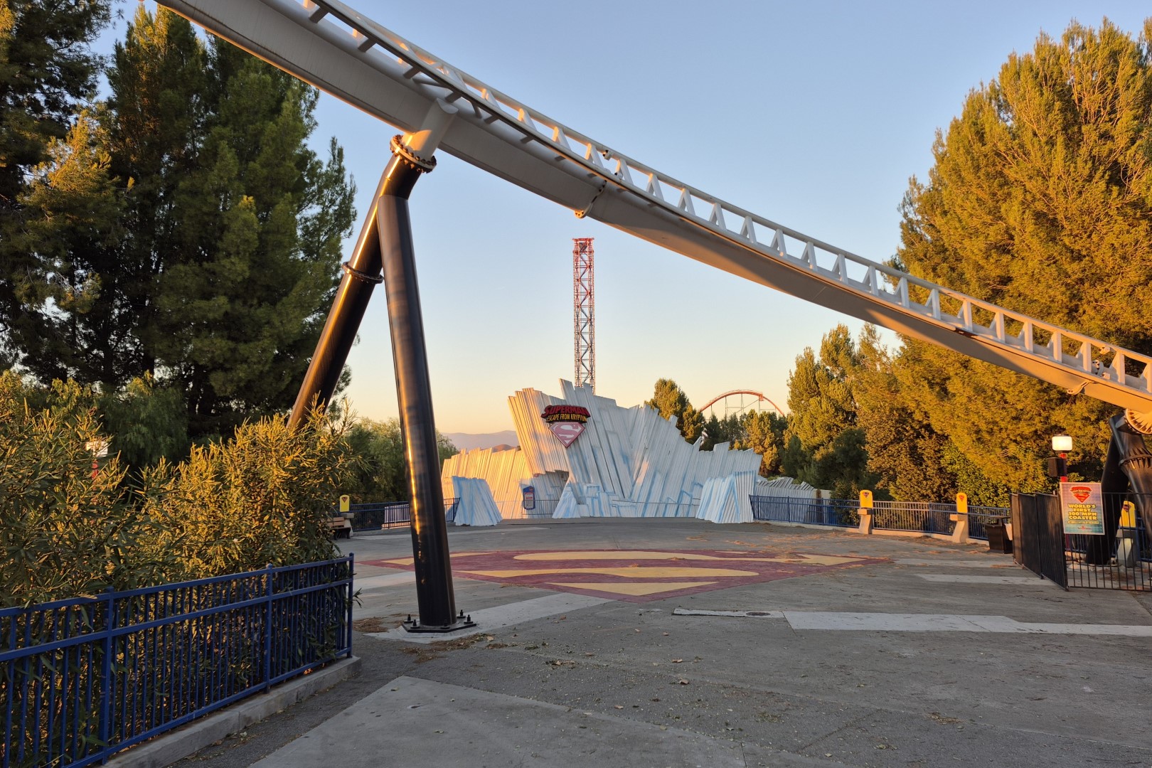 Wanneer je alle rollercoasters van Six Flags Magic Mountain één maal bezoekt, word je in totaal negen keer gelanceerd. Twee van die acceleraties moeten we vandaag echter sowieso missen. De beide tracks van Superman – Escape From Krypton zijn immers al een tijdje standing but not operating. Volgens bepaalde geruchten zou deze achtbaan, die ooit de hoogste en snelste van de planeet was, zelfs nooit meer openen. En eerlijk gezegd… ik zou het geen ramp vinden. De lay-out van deze coasters is wel erg minimalistisch en de lancering was allesbehalve intens. Bovendien maakte het ding een kabaal waar het menselijke oor nauwelijks tegen bestand is.