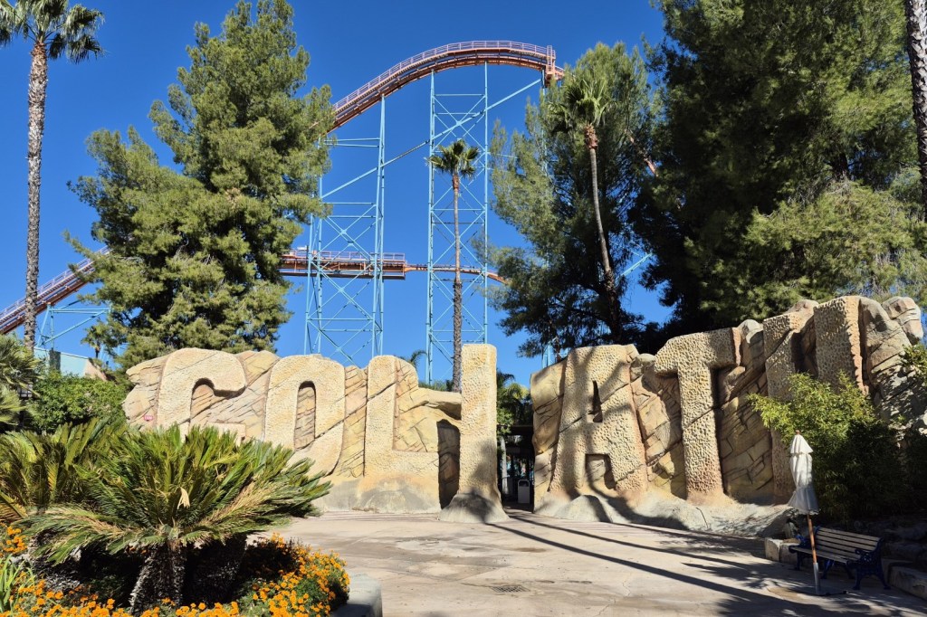 Op het moment van publicatie staan er maar liefst 21 verschillende achtbanen in Six Flags Magic Mountain. Dat zijn, voor alle duidelijkheid, meer rollercoasters dan Walibi Belgium en Walibi Holland tezamen hebben. Veel dus. Eigenlijk zelfs te veel om op een dag te beleven. Tijdens ons bezoek opent Six Flags Magic Mountain de poorten om half elf en om zes uur ‘s avonds is de pret alweer voorbij. Ingewikkelde wiskunde leert me dat we ieder uur drie rollercoasters moeten bedwingen om ze allemaal gedaan te krijgen. Onmogelijk, dat beseffen we meteen. Gelukkig mag ik melden dat Six Flags Magic Mountain tijdens het laagseizoen haast altijd meerdere rides dicht houdt. Bij houten achtbaan Apocalypse, hyper coaster Goliath en een aantal flatrides blijven de deuren vandaag stevig op slot. Dat maakt onze dag al makkelijker.