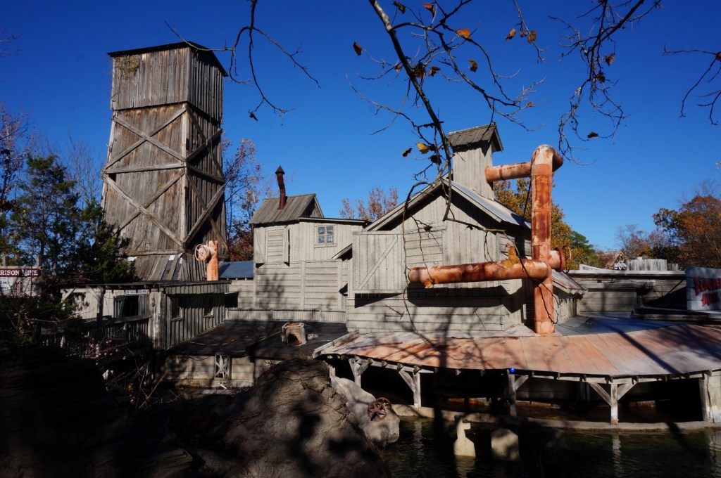 Silver Dollar City in november bezoeken, dat heeft voor- en nadelen. Aan de positieve kant zijn er de prachtige kerstdecoraties en de zeer vroege zonsondergang, waardoor we vier uur lang van nachtelijke ritjes op de achtbanen kunnen profiteren. Het grootste nadeel is de sluiting van een aantal waterattracties. In Hugo’s Hill Street stonden we al voor een gesloten American Plunge, een vrij standaard boomstammenbaan. In Rivertown worden we dan weer geconfronteerd met de gesloten toegangspoorten van Tom & Huck’s RiverBlast en Mystic River Falls. Dat zijn respectievelijk een splash battle en een rapid river. De eerstgenoemde zou ik sowieso overslaan, maar Mystic River Falls had ik graag eens zelf beleefd. Deze raftingbaan werd namelijk prachtig geïntegreerd in de natuurlijke omgeving. Op een YouTube-video zie ik bovendien dat de rivier behoorlijk wild kolkt en dat de afsluitende drop ronduit spectaculair is. Hopelijk kunnen we Mystic River Falls tijdens een volgend bezoek eens in werking zien.