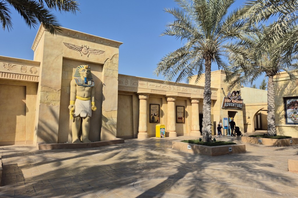 Het Adventure-gebied bestaat uit twee onderdelen. Wave Racers en Submarine Adventure behoren tot een Atlantis-achtige zone, terwijl we even verderop worden ondergedompeld in een Oud-Egyptisch sfeertje. Dat is een vaak gebruikt onderwerp in themaparken, maar zelden is het zo overtuigend als hier. Wanneer je de gemiddelde dagtemperatuur van Dubai in rekening brengt, voelt het inderdaad alsof je middenin de Egyptische woestijn belandde. Een tien voor geloofwaardigheid, maar de daarbij horende attractie scoort helaas minder goeie punten. Lost Kingdom Adventure heeft een saaie ovalen lay-out en de scènes zijn wat kaaltjes. Het schietspel met laserpistolen trekt je aandacht weliswaar een beetje weg van de simpele decors, maar de totaalervaring blijft matig. Dankzij Challenge of Tutankhamon en Tomb Blaster weet ik dat Egyptisch gethematiseerde darkrides heel wat knapper kunnen zijn.