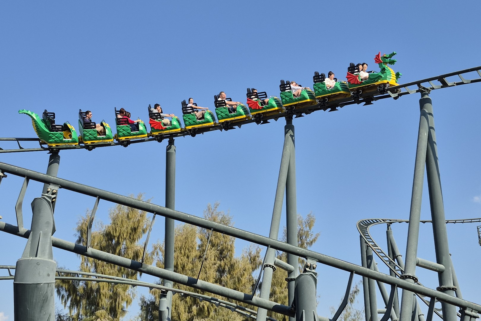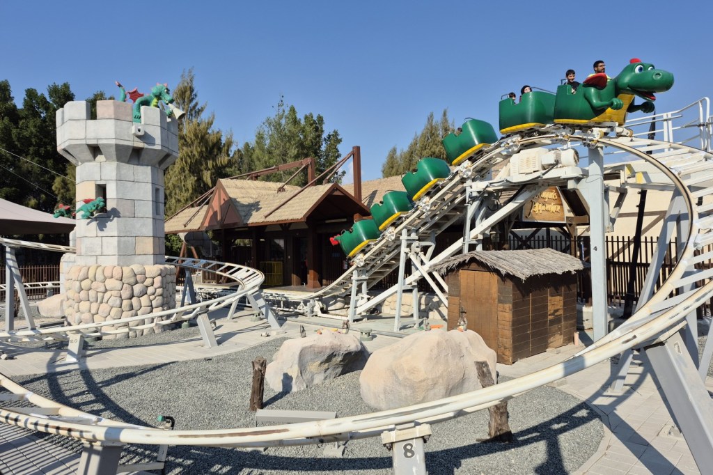 Een drakenachtbaan is vaste kost in elke vestiging van Legoland en dus ook in Dubai. In dit geval is Dragon een moderne Zierer-coaster. En net zoals dat bij de meeste soortgenoten het geval is, rijdt de trein eerst door een middeleeuws gethematiseerd stukje darkride. Daaraan merk je meteen dat Legoland Dubai nog een vrij nieuw park is, want dat gedeelte vol Lego-bouwsels ziet er fris uit. Ook leuk is het verrassende dropje dat op het einde van de darkride zit, waarna we een achtbaangedeelte in de buitenlucht beleven. We worden eerst naar een hoogte van 16 meter getakeld, waarna de drakentrein een bochtige lay-out aflegt. Qua snelheid en g-krachten voelt deze versie net wat intenser aan dan de naamgenoten in Billund en Windsor, dus ik vind het een prima ding. Dragon is voor kinderen ook een ideale eerste ‘grote’ achtbaan.