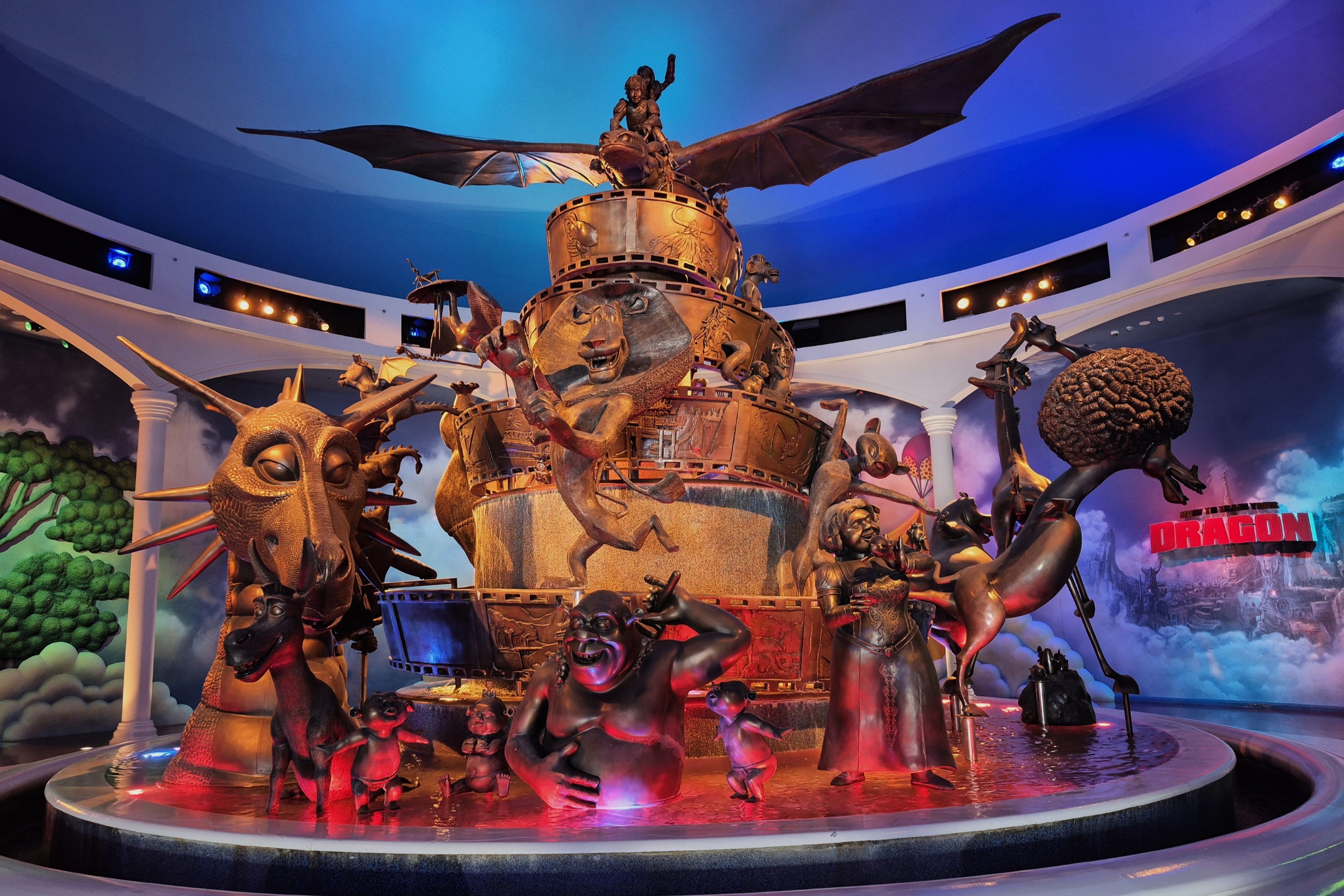 We laten Lionsgate achter ons en wandelen naar het volgende studiogebied. Die volgende zone heet DreamWorks en werd gebaseerd op vier succesformules van de gelijknamige animatiestudio: Kung Fu Panda, Madagascar, How To Train Your Dragon en Shrek. DreamWorks is ongetwijfeld het meest opvallende gebied van Motiongate. Dat is te danken aan de centrale locatie, aan het feit dat de zone zich volledig indoor bevindt én aan het waanzinnig hoge themaniveau. Alleen al de Fountain of Dreams, een reusachtige fontein aan de ingang van het complex, doet m’n mond openvallen van verbazing.