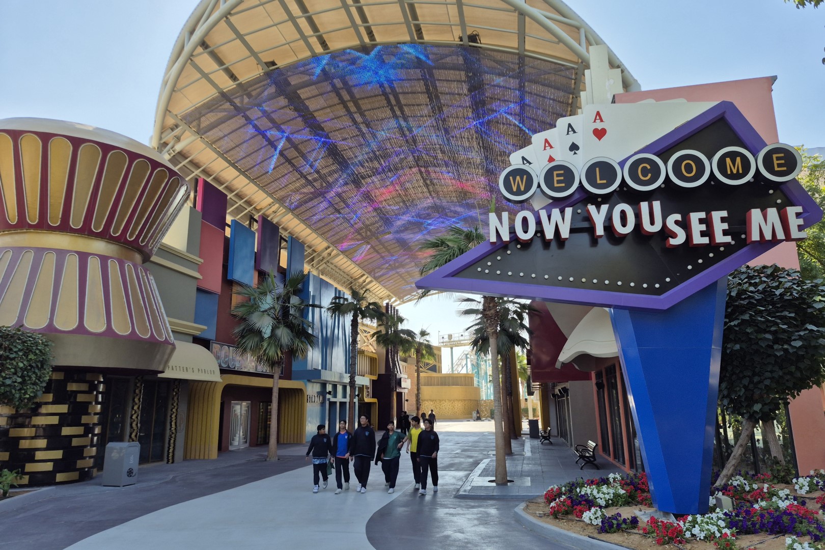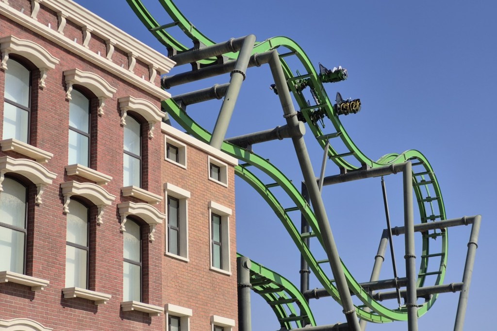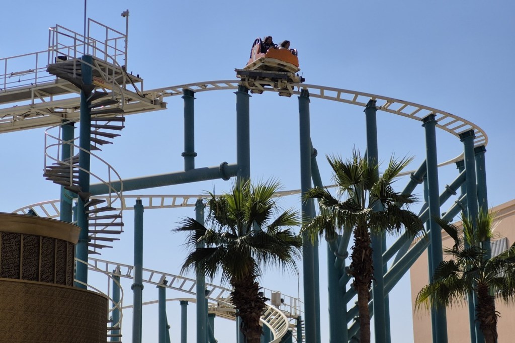 Een van die rides is Now You See Me – High Roller, die vernoemd werd naar een filmreeks vol illusies en magie. Het is cool dat Motiongate hiervoor een stukje Las Vegas naar de Emiraten haalde. Men bouwde namelijk een replica van de beroemde Fremont Street, inclusief het lichtgevende dak. Het station en de wachtruimte van de baan bevinden zich dan weer in het fictieve Golden Mirage Casino. Helaas voelt het aan alsof het budget daarmee opgesoupeerd was, want de eigenlijke achtbaan staat in een saaie zandbak. Er is tijdens de rit bijgevolg niks bijzonders te zien, maar High Roller levert desalniettemin een plezierige ervaring. Opvallende elementen zijn de 17 meter hoge first drop en een bijzondere bochtencombinatie, die door de Roller Coaster Database zelfs als een ‘non-inverting loop’ beschouwd wordt. Ook de uitgestrektheid van de baan is opmerkelijk. Maurer bouwt vaak zeer compacte spinning coasters, maar in dit geval is het grondoppervlak enorm. Het doet me vermoeden dat de lay-out eigenlijk ontworpen werd om interactie te hebben met wandelpaden, theming of andere attracties in Six Flags, maar die interactie is er in Motiongate niet.