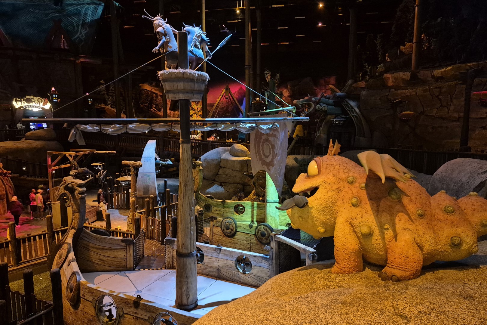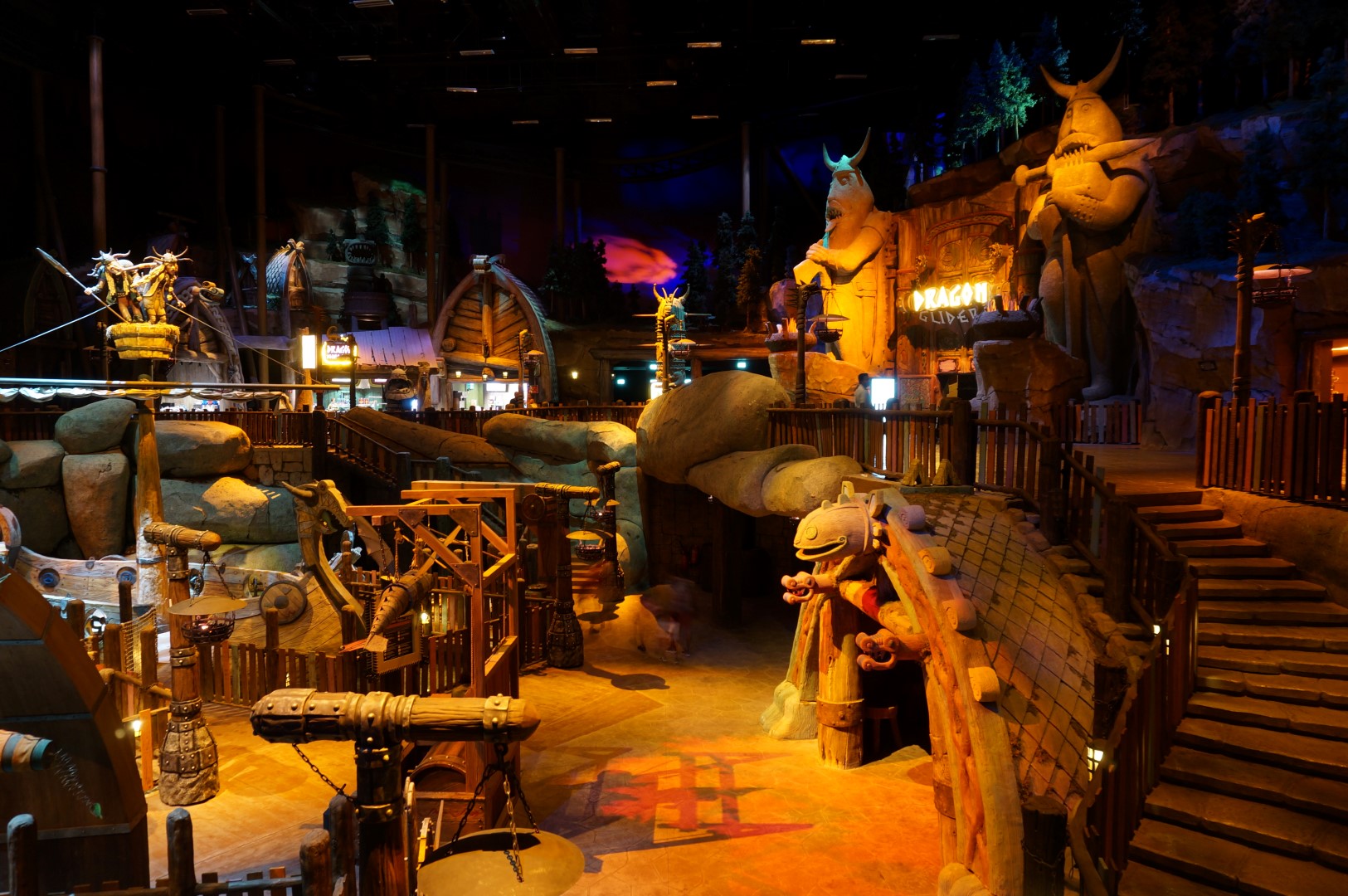 Net zoals de gelijknamige films is het Madagascar-gebied een beetje hectisch, maar vooral kleurrijk en vrolijk. Dat staat in schril contrast met het ietwat duistere Vikingdorp Berk, waar How To Train Your Dragon zich afspeelt. Deze filmfranchise staat al jaren hoog op m’n favorietenlijst en de magistrale soundtrack klinkt regelmatig door m’n koptelefoon. Het is dus heerlijk om de zone te betreden die op dit DreamWorks-pareltje gebaseerd werd. Motiongate spaarde kosten noch moeite om hier een immersieve belevenis neer te zetten. De aangemeerde Vikingschepen, de brute rotsformaties en de nachtelijke hemel doen me effectief geloven dat we in een gevaarlijke drakenwereld beland zijn.