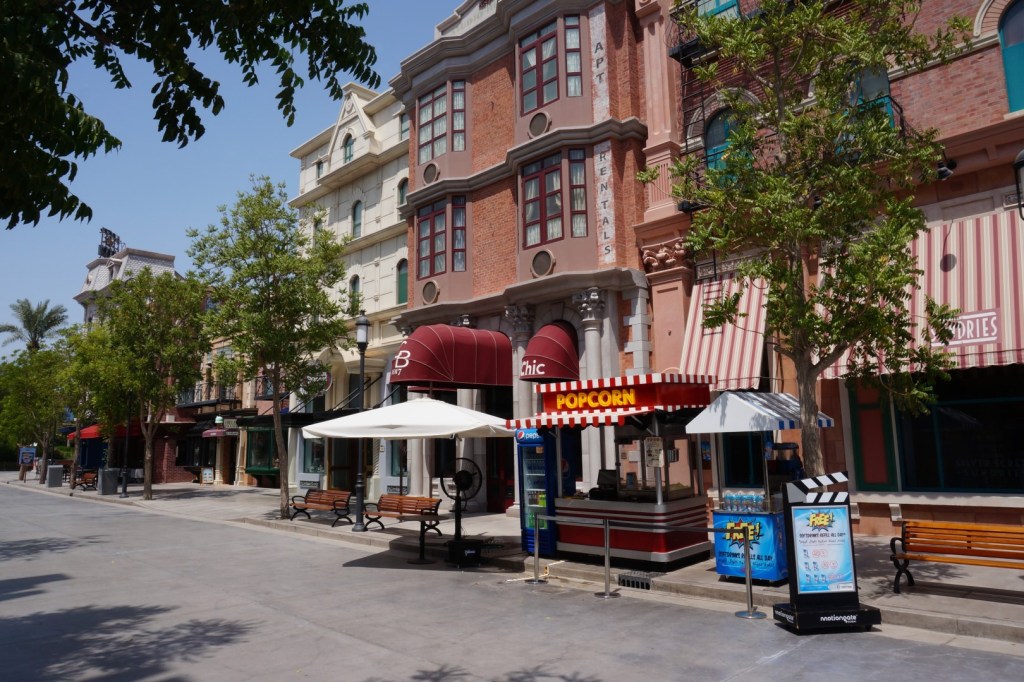 We wandelen naar de noordwestelijke uithoek van Riverland, waar de imposante toegangspoort van Motiongate al van ver zichtbaar is. We laten onze tickets scannen door een breed glimlachend personeelslid en betreden vervolgens Studio Central. Deze hoofdboulevard bevat enkele prachtige façades en de bombastische filmmuziek creëert meteen een heerlijke sfeer. Als ik niet beter wist, zou ik me zelfs in Universal Studios wanen. De lay-out van het park lijkt dan weer gebaseerd op Disney’s Magic Kingdom. De hoofdstraat leidt namelijk naar een centrale hub, van waaruit je de verschillende themagebieden kan betreden. Die zones zijn in Motiongate niet zozeer gebaseerd op een specifiek thema, maar eerder op verschillende filmstudio’s en hun producties. Naast de Main Street en het Smurfendorp vind je hier bijvoorbeeld gebieden rond Columbia Pictures, DreamWorks en Lionsgate.